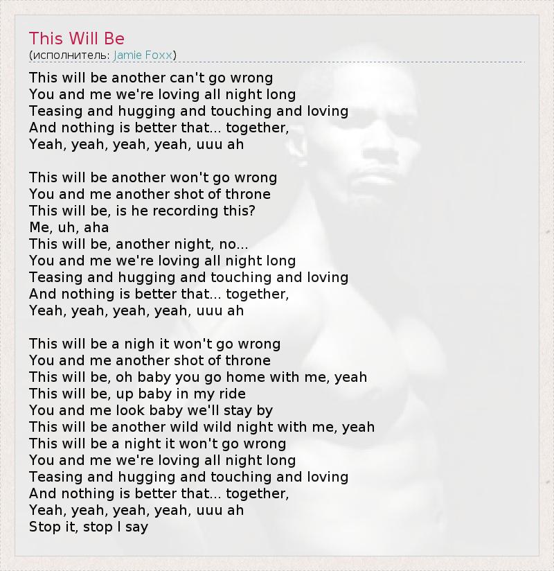 This will be another can't go wrong You and me we're loving all night long Teasing and hugging and touching and loving And nothing is better that... together, Yeah, yeah, yeah, yeah, uuu ah This will be another won't go wrong You and me another shot of throne This will be, is he recording this? Me, uh, aha This will be, another night, no... You and me we're loving all night long Teasing and hugging and touching and loving And nothing is better that... together, Yeah, yeah, yeah, yeah, uuu ah This will be a nigh it won't go wrong You and me another shot of throne This will be, oh baby you go home with me, yeah This will be, up baby in my ride You and me look baby we'll stay by This will be another wild wild night with me, yeah This will be a night it won't go wrong You and me we're loving all night long Teasing and hugging and touching and loving And nothing is better that... together, Yeah, yeah, yeah, yeah, uuu ah Stop it, stop I say