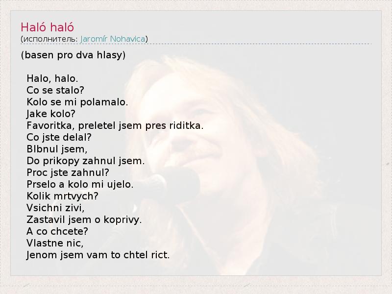 Это интересно:Я́ромир Но́гавица, известный также как Я́рек Ногавица — чешский поэт, композитор, мультиинструменталист, автор и исполнитель песен. Родился 7 июня 1953 г. в Остраве. Закончив среднюю общеобразовательную школу и школу библиотечного искусства в Брно, он поступил в политехнический университет горного дела в Остраве, но не закончил обучение.Ногавица начал играть на гитаре с 13 лет. Несмотря... продолжение