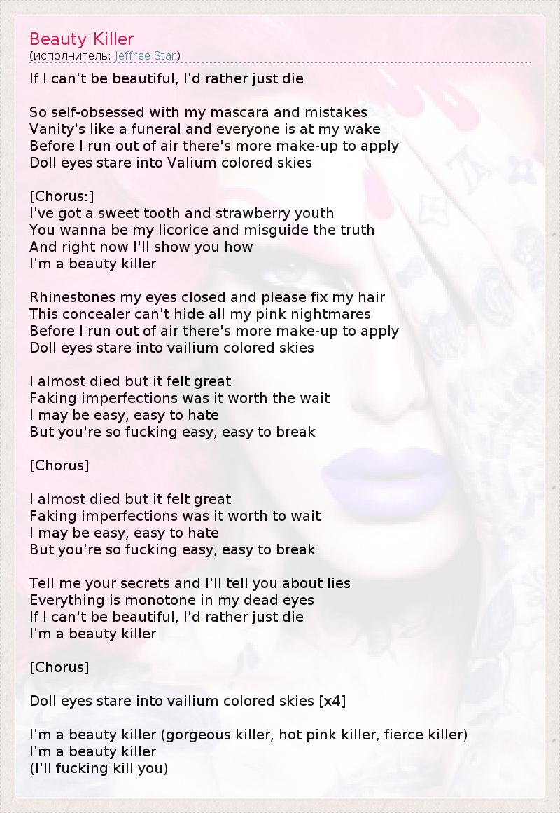 Если я не могу быть красивым, я лучше просто умру. Я так зациклен на себе со своей тушью и недочетами. Суета, как на похоронах, и все присутствуют на моих поминках. Прежде чем у меня закончится воздух, остается нанести еще макияжа. Кукольные глазки уставились в раскрашенные от "Валиума" 1 небеса. [Припев:] Я сладкоежка, у меня прыщавая юность. Ты хочешь быть моей лакричной конфетой и исказить правду. И прямо сейчас я покажу тебе, как - Я уничтожаю красоту. Наклей стразы на мои закрытые глаза и, пожалуйста, поправь мне волосы. Этот тональник не может скрыть всех моих розовых ночных кошмаров. Прежде чем у меня закончится воздух, остается нанести еще макияжа. Кукольные глазки уставились в раскрашенные от "Валиума" небеса. Я почти умер, но это было замечательно. Вымышленные недостатки, ожидание того стоило. Меня можно легко, легко возненавидеть, Но тебя, черт побери, так легко, легко сломать. [Припев] Я почти умер, но это было замечательно - Выдумывать недостатки. Ожидание - стоило ли оно того? Меня можно легко, легко возненавидеть, Но тебя, черт побери, так легко, легко сломать... Поведай мне свои тайны, а я расскажу тебе про ложь. Все такое однообразное в моих мертвых глазах. Если я не могу быть красивым, я лучше просто умру, Я - убийца красоты. [Припев] Кукольные глазки уставились в раскрашенные от Валиума небеса. [x4] Я - убийца красоты (шикарный убийца, ярко-розовый убийца, безжалостный убийца) Я - убийца красоты. (Я убью тебя, черт побери) 1 - транквилизатор, успокаивающий и снимающий возбуждение препарат