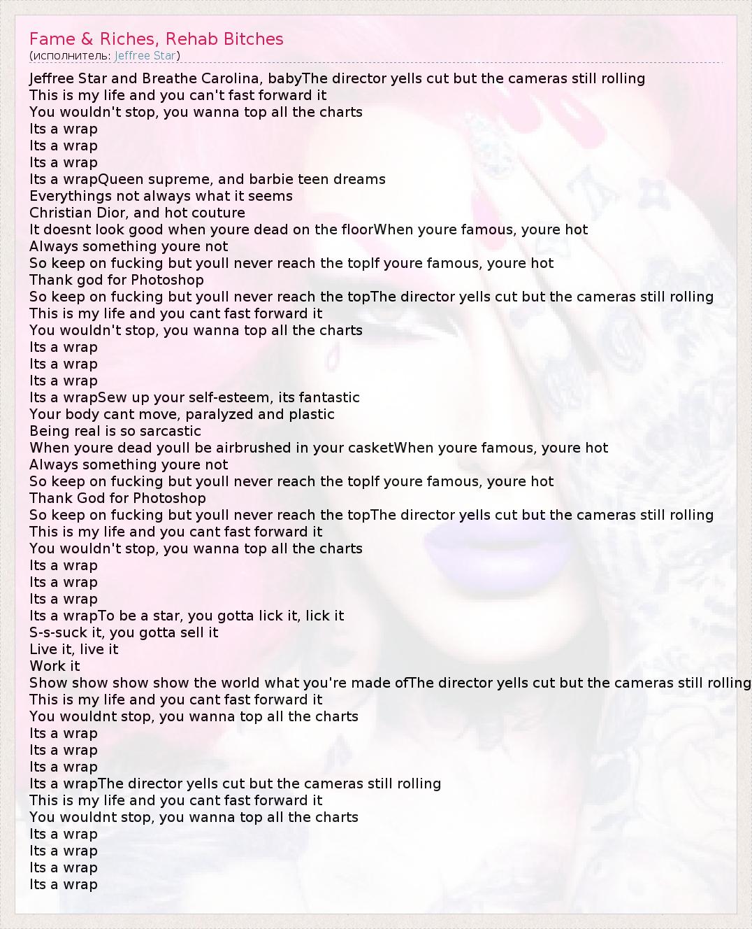 А как ты думаешь, о чем песня "Fame & Riches, Rehab Bitches" ?