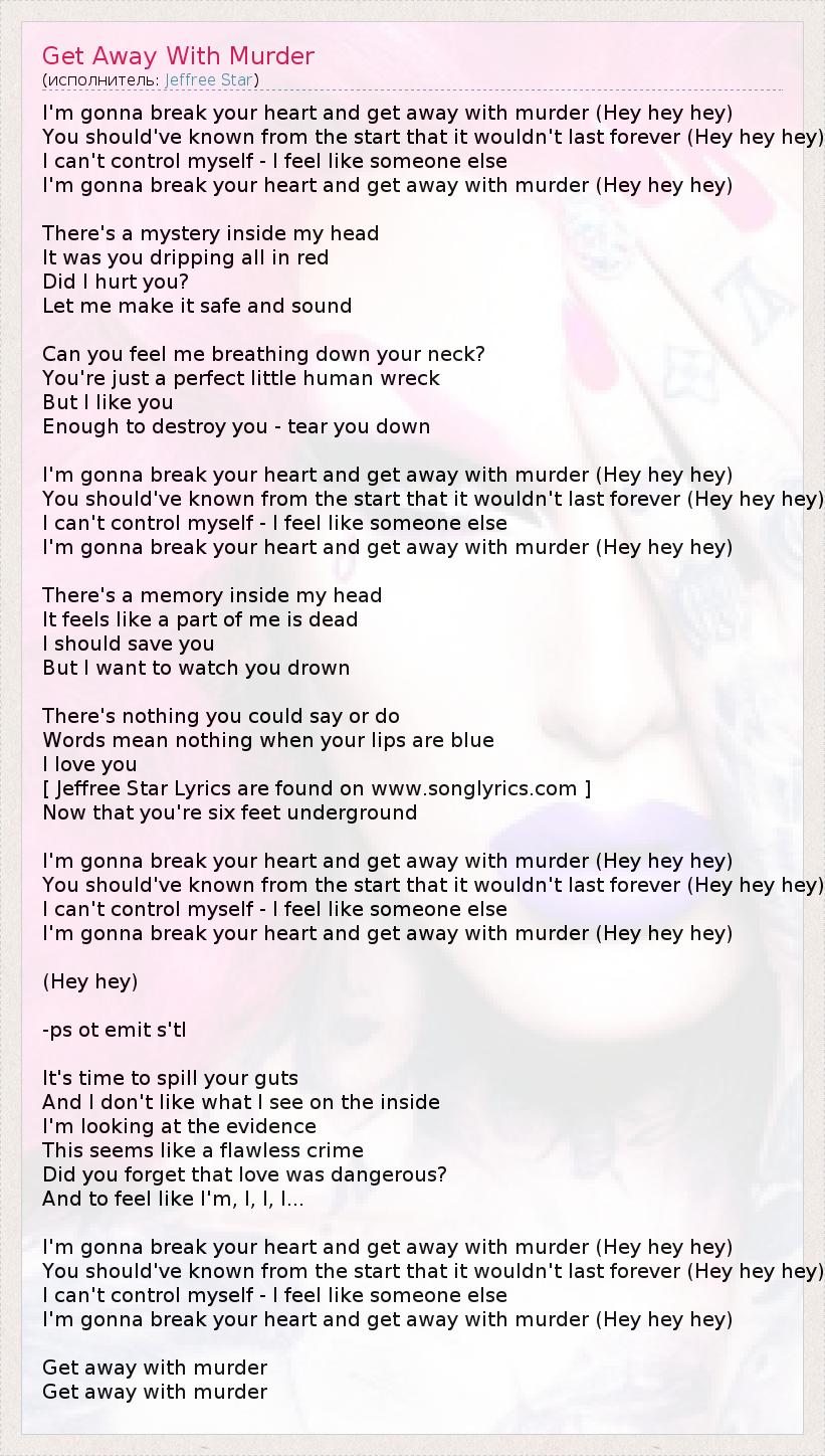 I'm gonna break your heart and get away with murder (Hey hey hey) You should've known from the start that it wouldn't last forever (Hey hey hey) I can't control myself - I feel like someone else I'm gonna break your heart and get away with murder (Hey hey hey) There's a mystery inside my head It was you dripping all in red Did I hurt you? Let me make it safe and sound Can you feel me breathing down your neck? You're just a perfect little human wreck But I like you Enough to destroy you - tear you down I'm gonna break your heart and get away with murder (Hey hey hey) You should've known from the start that it wouldn't last forever (Hey hey hey) I can't control myself - I feel like someone else I'm gonna break your heart and get away with murder (Hey hey hey) There's a memory inside my head It feels like a part of me is dead I should save you But I want to watch you drown There's nothing you could say or do Words mean nothing when your lips are blue I love you [ Jeffree Star Lyrics are found on www.songlyrics.com ] Now that you're six feet underground I'm gonna break your heart and get away with murder (Hey hey hey) You should've known from the start that it wouldn't last forever (Hey hey hey) I can't control myself - I feel like someone else I'm gonna break your heart and get away with murder (Hey hey hey) (Hey hey) -ps ot emit s'tI It's time to spill your guts And I don't like what I see on the inside I'm looking at the evidence This seems like a flawless crime Did you forget that love was dangerous? And to feel like I'm, I, I, I... I'm gonna break your heart and get away with murder (Hey hey hey) You should've known from the start that it wouldn't last forever (Hey hey hey) I can't control myself - I feel like someone else I'm gonna break your heart and get away with murder (Hey hey hey) Get away with murder Get away with murder