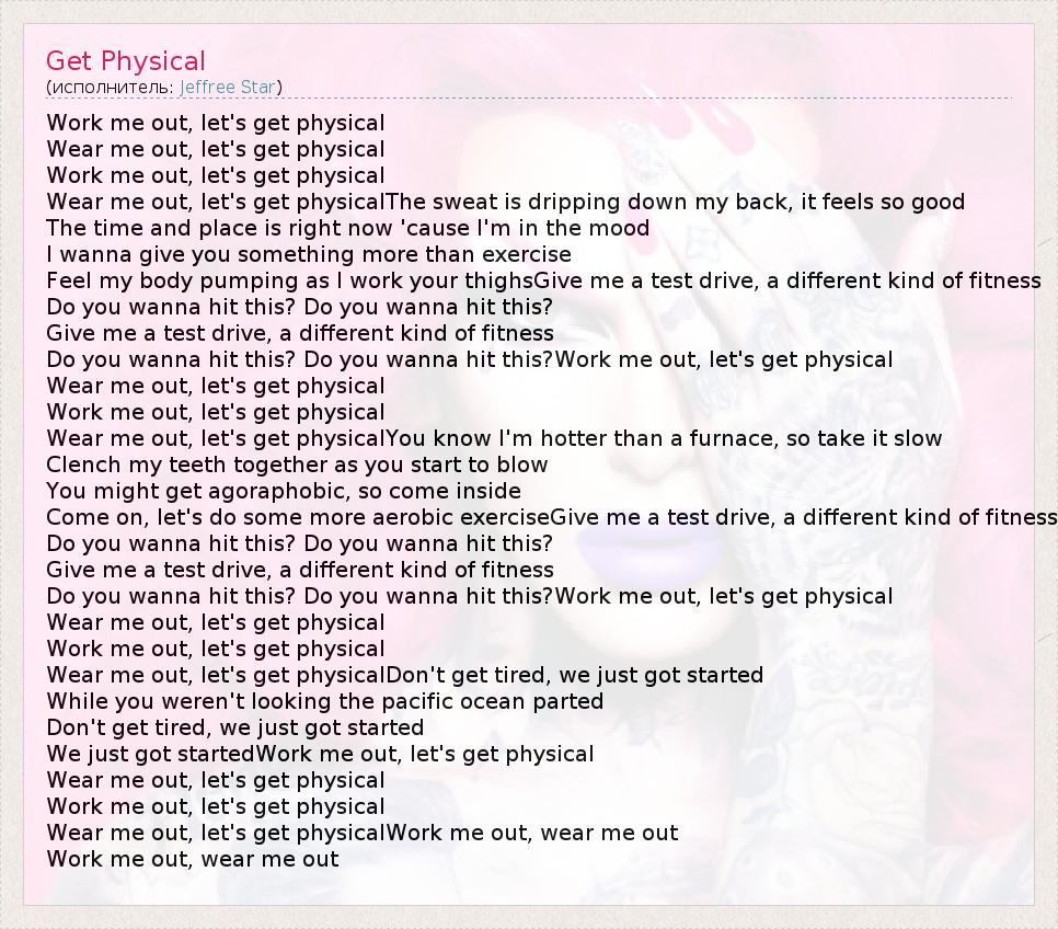 Work me out, let's get physical Wear me out, let's get physical Work me out, let's get physical Wear me out, let's get physicalThe sweat is dripping down my back, it feels so good The time and place is right now 'cause I'm in the mood I wanna give you something more than exercise Feel my body pumping as I work your thighsGive me a test drive, a different kind of fitness Do you wanna hit this? Do you wanna hit this? Give me a test drive, a different kind of fitness Do you wanna hit this? Do you wanna hit this?Work me out, let's get physical Wear me out, let's get physical Work me out, let's get physical Wear me out, let's get physicalYou know I'm hotter than a furnace, so take it slow Clench my teeth together as you start to blow You might get agoraphobic, so come inside Come on, let's do some more aerobic exerciseGive me a test drive, a different kind of fitness Do you wanna hit this? Do you wanna hit this? Give me a test drive, a different kind of fitness Do you wanna hit this? Do you wanna hit this?Work me out, let's get physical Wear me out, let's get physical Work me out, let's get physical Wear me out, let's get physicalDon't get tired, we just got started While you weren't looking the pacific ocean parted Don't get tired, we just got started We just got startedWork me out, let's get physical Wear me out, let's get physical Work me out, let's get physical Wear me out, let's get physicalWork me out, wear me out Work me out, wear me out