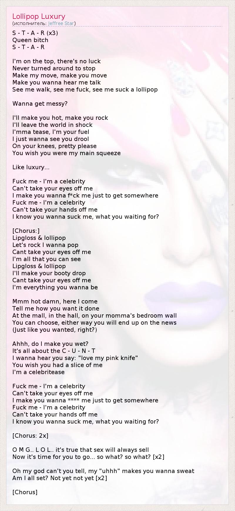 З-В-Е-З-Д-А (х3) Королева-Сучка З-В-Е-З-Д-А Я сверху, как ни крути, Никогда не шёл на попятную. Двигаюсь сам и заведу тебя, Ты захочешь меня услышать. Смотри на меня, что я вытворяю в постели, как сосу леденец. Хочешь потерять самоконтроль? Ты возбудишься, будешь отжигать, Я шокирую весь мир. Я буду тебя дразнить; буду воспламеняющим тебя топливом. Я хочу увидеть, как потечет твоя слюна. На колени, красотка, ну же. Ты хотела бы быть моей главной подружкой*. Люблю роскошь... Трах*уться можно - я звезда! Не можешь отвести от меня глаз. Ты захочешь трах*уть меня, чтобы просто появиться на первых полосах. Трах*уться можно - я звезда! Не можешь оторвать от меня рук. Я знаю, ты хочешь отсосать мне, так чего же ты ждешь? [Припев:] Блеск для губ и леденец, Давай зажжем, я хочу секса. Ты не можешь отвести от меня взгляд, Ты видишь только меня. Блеск для губ и леденец, Твоя зад*ица будет трястись. Не можешь отвести от меня взгляд, Ты хочешь быть мной. Ммм, чертовски горяч, вот он я! Скажи, как ты хочешь, чтобы мы сделали это? В магазине, в коридоре или опираясь на стену в спальне твоей мамы? Выбирай! В любом случае, ты окажешься во всех новостях! (Ты ведь этого и хотела, не так ли?) Охх, ты уже вся мокрая? Это всё С-Е-К-С. Хочу услышать, как ты говоришь: "Мой любимый розовый нож". Ты бы хотела съесть кусочек меня. Я дразнименитость**. Трах*уться можно - я звезда! Не можешь отвести от меня глаз. Ты захочешь трах*уть меня, чтобы просто появиться на первых полосах. Трах*уться можно - я звезда! Не можешь оторвать от меня рук. Я знаю, ты хочешь отсосать мне, так чего же ты ждешь? [Припев: 2 раза] БОЖЕ МОЙ.. РЖУНИМАГУ.. секс и вправду всегда будет продаваться. Теперь пришло твое время.. и что с того? Что с того?! [x2] Боже, да скажи уже, что от моего "А, а, а..." ты вся заводишься. Все готово? Не совсем. Не совсем. [x2] [Припев] * - т.к. Jeffree Star трансвестит, то эта песня обращена к мужчинам в той же степени, что и к женщинам, если не в большей ** - неологизм = знаменитость, которая любит дразнить