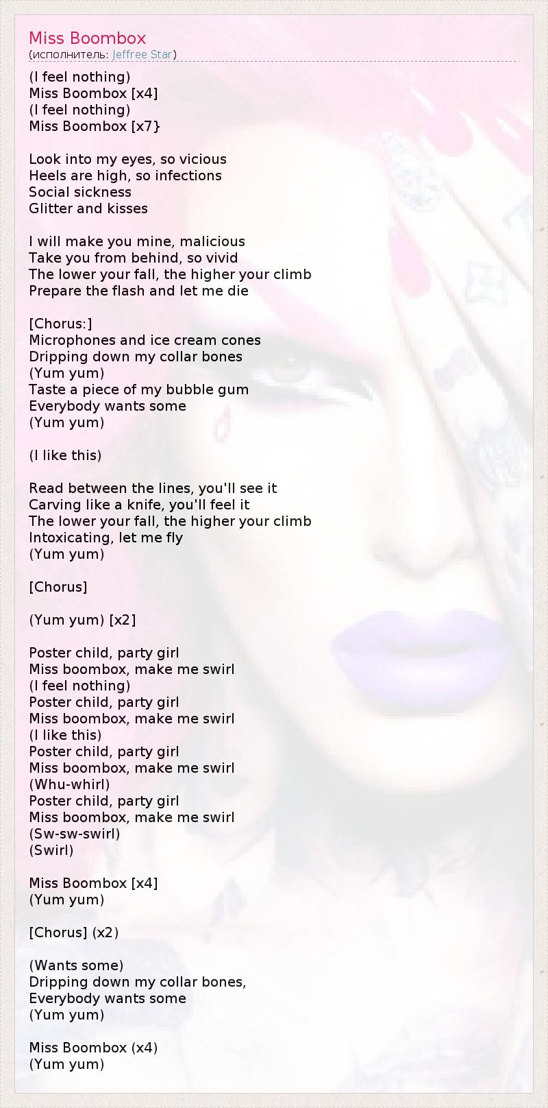 (I feel nothing) Miss Boombox [x4] (I feel nothing) Miss Boombox [x7} Look into my eyes, so vicious Heels are high, so infections Social sickness Glitter and kisses I will make you mine, malicious Take you from behind, so vivid The lower your fall, the higher your climb Prepare the flash and let me die [Chorus:] Microphones and ice cream cones Dripping down my collar bones (Yum yum) Taste a piece of my bubble gum Everybody wants some (Yum yum) (I like this) Read between the lines, you'll see it Carving like a knife, you'll feel it The lower your fall, the higher your climb Intoxicating, let me fly (Yum yum) [Chorus] (Yum yum) [x2] Poster child, party girl Miss boombox, make me swirl (I feel nothing) Poster child, party girl Miss boombox, make me swirl (I like this) Poster child, party girl Miss boombox, make me swirl (Whu-whirl) Poster child, party girl Miss boombox, make me swirl (Sw-sw-swirl) (Swirl) Miss Boombox [x4] (Yum yum) [Chorus] (x2) (Wants some) Dripping down my collar bones, Everybody wants some (Yum yum) Miss Boombox (x4) (Yum yum)