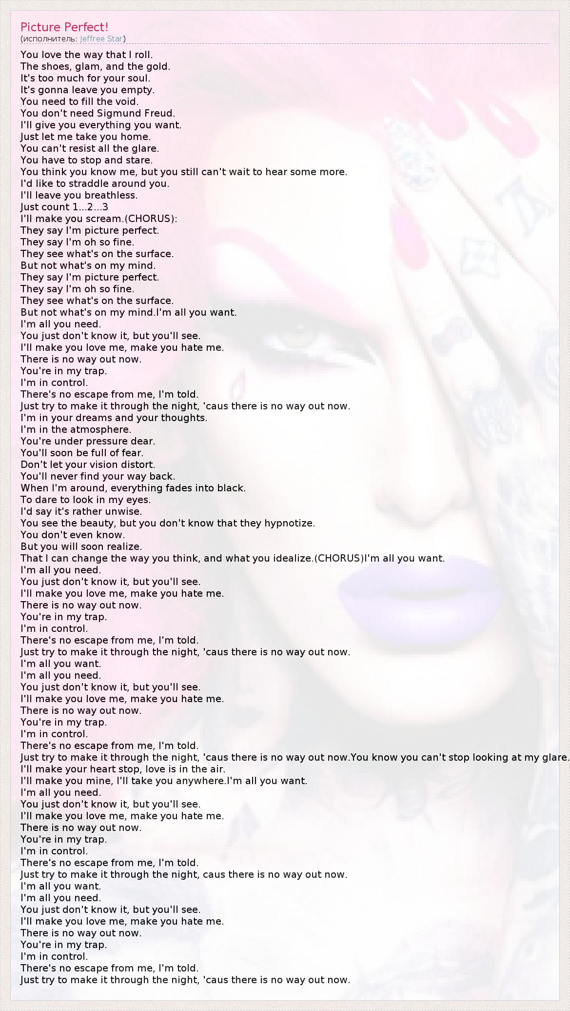 You love the way that I roll. The shoes, glam, and the gold. It's too much for your soul. It's gonna leave you empty. You need to fill the void. You don't need Sigmund Freud. I'll give you everything you want. Just let me take you home. You can't resist all the glare. You have to stop and stare. You think you know me, but you still can't wait to hear some more. I'd like to straddle around you. I'll leave you breathless. Just count 1...2...3 I'll make you scream.(CHORUS): They say I'm picture perfect. They say I'm oh so fine. They see what's on the surface. But not what's on my mind. They say I'm picture perfect. They say I'm oh so fine. They see what's on the surface. But not what's on my mind.I'm all you want. I'm all you need. You just don't know it, but you'll see. I'll make you love me, make you hate me. There is no way out now. You're in my trap. I'm in control. There's no escape from me, I'm told. Just try to make it through the night, 'caus there is no way out now. I'm in your dreams and your thoughts. I'm in the atmosphere. You're under pressure dear. You'll soon be full of fear. Don't let your vision distort. You'll never find your way back. When I'm around, everything fades into black. To dare to look in my eyes. I'd say it's rather unwise. You see the beauty, but you don't know that they hypnotize. You don't even know. But you will soon realize. That I can change the way you think, and what you idealize.(CHORUS)I'm all you want. I'm all you need. You just don't know it, but you'll see. I'll make you love me, make you hate me. There is no way out now. You're in my trap. I'm in control. There's no escape from me, I'm told. Just try to make it through the night, 'caus there is no way out now. I'm all you want. I'm all you need. You just don't know it, but you'll see. I'll make you love me, make you hate me. There is no way out now. You're in my trap. I'm in control. There's no escape from me, I'm told. Just try to make it through the night, 'caus there is no way out now.You know you can't stop looking at my glare. I'll make your heart stop, love is in the air. I'll make you mine, I'll take you anywhere.I'm all you want. I'm all you need. You just don't know it, but you'll see. I'll make you love me, make you hate me. There is no way out now. You're in my trap. I'm in control. There's no escape from me, I'm told. Just try to make it through the night, caus there is no way out now. I'm all you want. I'm all you need. You just don't know it, but you'll see. I'll make you love me, make you hate me. There is no way out now. You're in my trap. I'm in control. There's no escape from me, I'm told. Just try to make it through the night, 'caus there is no way out now.