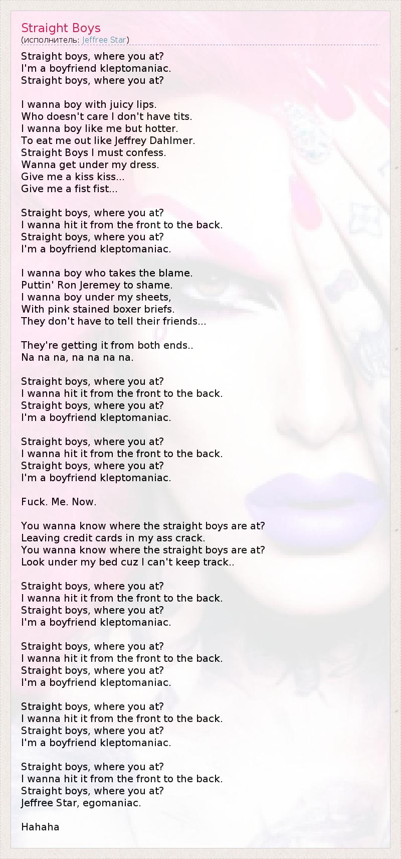 Straight boys, where you at? I'm a boyfriend kleptomaniac. Straight boys, where you at? I wanna boy with juicy lips. Who doesn't care I don't have tits. I wanna boy like me but hotter. To eat me out like Jeffrey Dahlmer. Straight Boys I must confess. Wanna get under my dress. Give me a kiss kiss... Give me a fist fist... Straight boys, where you at? I wanna hit it from the front to the back. Straight boys, where you at? I'm a boyfriend kleptomaniac. I wanna boy who takes the blame. Puttin' Ron Jeremey to shame. I wanna boy under my sheets, With pink stained boxer briefs. They don't have to tell their friends... They're getting it from both ends.. Na na na, na na na na. Straight boys, where you at? I wanna hit it from the front to the back. Straight boys, where you at? I'm a boyfriend kleptomaniac. Straight boys, where you at? I wanna hit it from the front to the back. Straight boys, where you at? I'm a boyfriend kleptomaniac. Fuck. Me. Now. You wanna know where the straight boys are at? Leaving credit cards in my ass crack. You wanna know where the straight boys are at? Look under my bed cuz I can't keep track.. Straight boys, where you at? I wanna hit it from the front to the back. Straight boys, where you at? I'm a boyfriend kleptomaniac. Straight boys, where you at? I wanna hit it from the front to the back. Straight boys, where you at? I'm a boyfriend kleptomaniac. Straight boys, where you at? I wanna hit it from the front to the back. Straight boys, where you at? I'm a boyfriend kleptomaniac. Straight boys, where you at? I wanna hit it from the front to the back. Straight boys, where you at? Jeffree Star, egomaniac. Hahaha