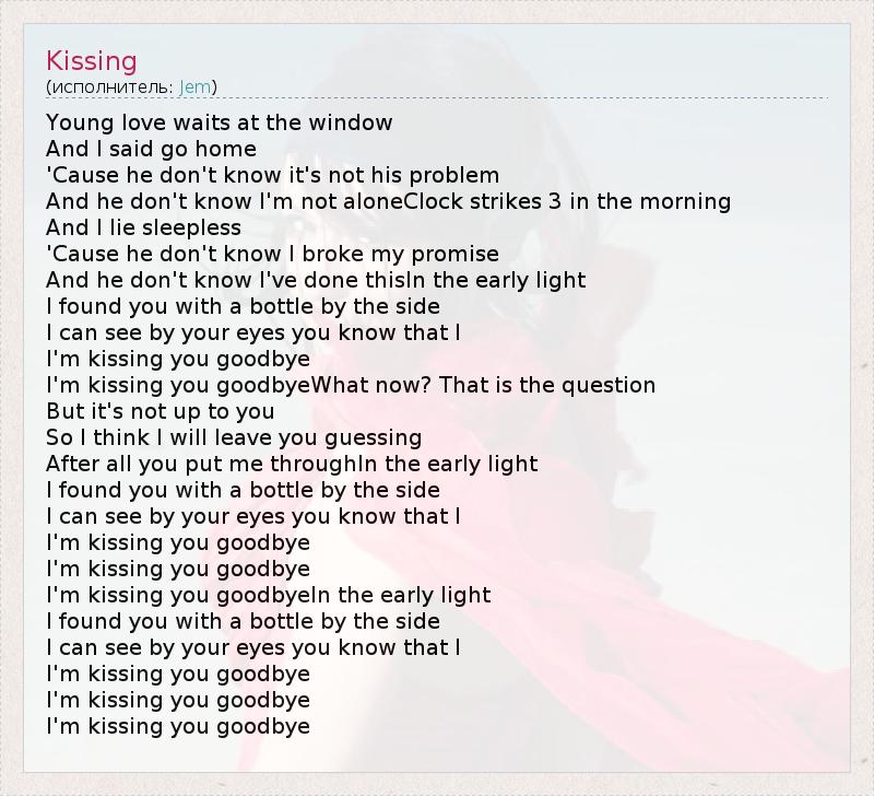 Young love waits at the window And I said go home 'Cause he don't know it's not his problem And he don't know I'm not aloneClock strikes 3 in the morning And I lie sleepless 'Cause he don't know I broke my promise And he don't know I've done thisIn the early light I found you with a bottle by the side I can see by your eyes you know that I I'm kissing you goodbye I'm kissing you goodbyeWhat now? That is the question But it's not up to you So I think I will leave you guessing After all you put me throughIn the early light I found you with a bottle by the side I can see by your eyes you know that I I'm kissing you goodbye I'm kissing you goodbye I'm kissing you goodbyeIn the early light I found you with a bottle by the side I can see by your eyes you know that I I'm kissing you goodbye I'm kissing you goodbye I'm kissing you goodbye