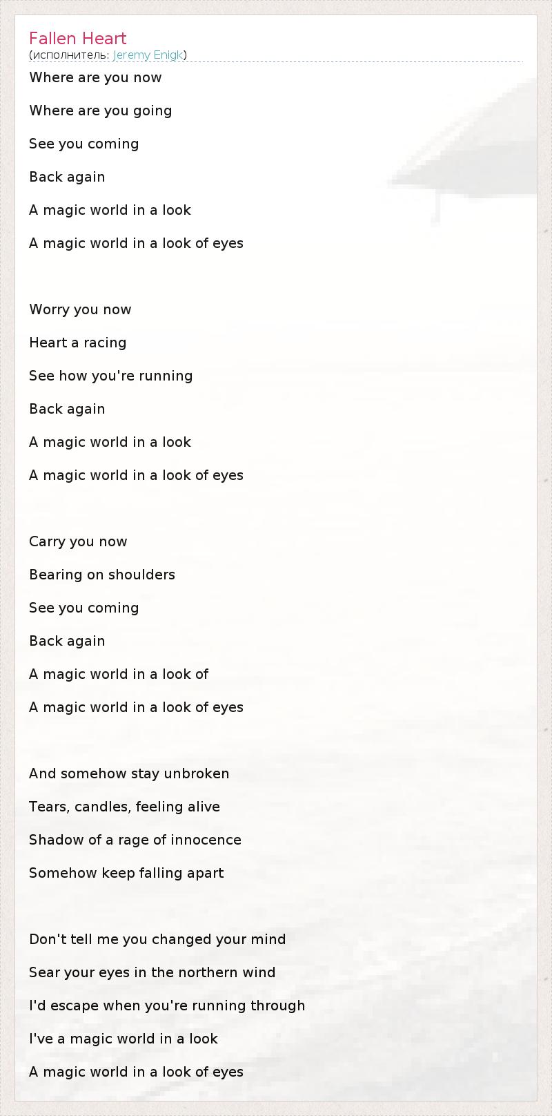 Where are you now Where are you going See you coming Back again A magic world in a look A magic world in a look of eyes Worry you now Heart a racing See how you're running Back again A magic world in a look A magic world in a look of eyes Carry you now Bearing on shoulders See you coming Back again A magic world in a look of A magic world in a look of eyes And somehow stay unbroken Tears, candles, feeling alive Shadow of a rage of innocence Somehow keep falling apart Don't tell me you changed your mind Sear your eyes in the northern wind I'd escape when you're running through I've a magic world in a look A magic world in a look of eyes