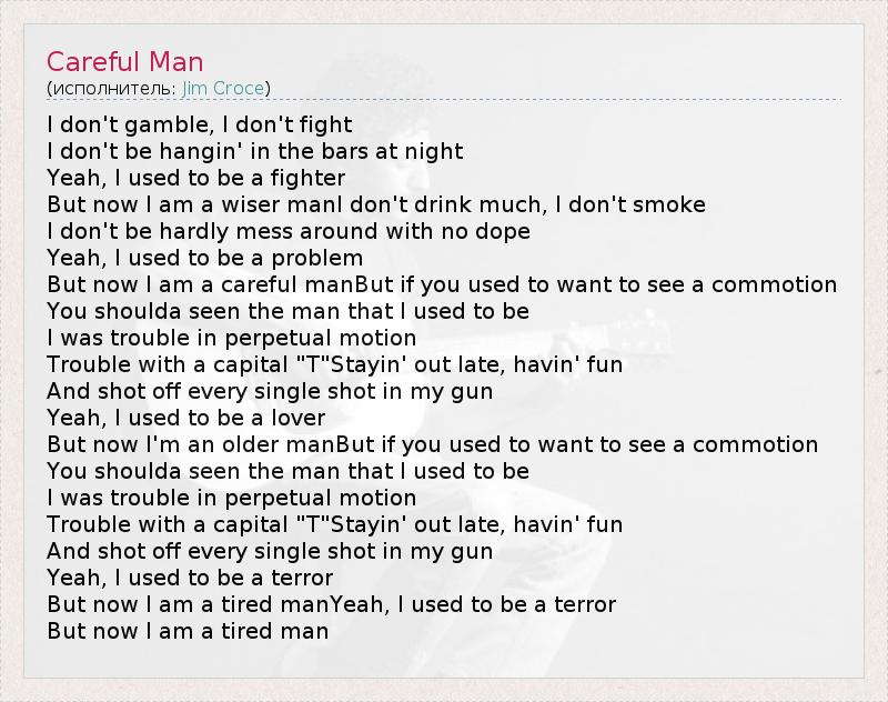 Это интересно:Певец, гитарист и композитор Джим Кроус родился 10 января 1943 года, умер 20 сентября 1973 года в США.Кроус профессионально начал играть на гитаре в 18 лет - он специализировался главным образом на фолк-роке с блюзовой «подкладкой». В 1967 году музыкант переехал в Нью -Йорк, в 1969 году подписал контракт с фирмой Capitol и в начале 70-х записал ряд хит-синглов, которые до сих пор считаются классикой фолк-блюза... продолжение