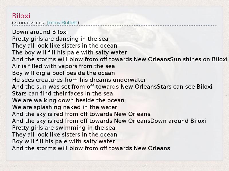 Down around Biloxi Pretty girls are dancing in the sea They all look like sisters in the ocean The boy will fill his pale with salty water And the storms will blow from off towards New OrleansSun shines on Biloxi Air is filled with vapors from the sea Boy will dig a pool beside the ocean He sees creatures from his dreams underwater And the sun was set from off towards New OrleansStars can see Biloxi Stars can find their faces in the sea We are walking down beside the ocean We are splashing naked in the water And the sky is red from off towards New Orleans And the sky is red from off towards New OrleansDown around Biloxi Pretty girls are swimming in the sea They all look like sisters in the ocean Boy will fill his pale with salty water And the storms will blow from off towards New Orleans