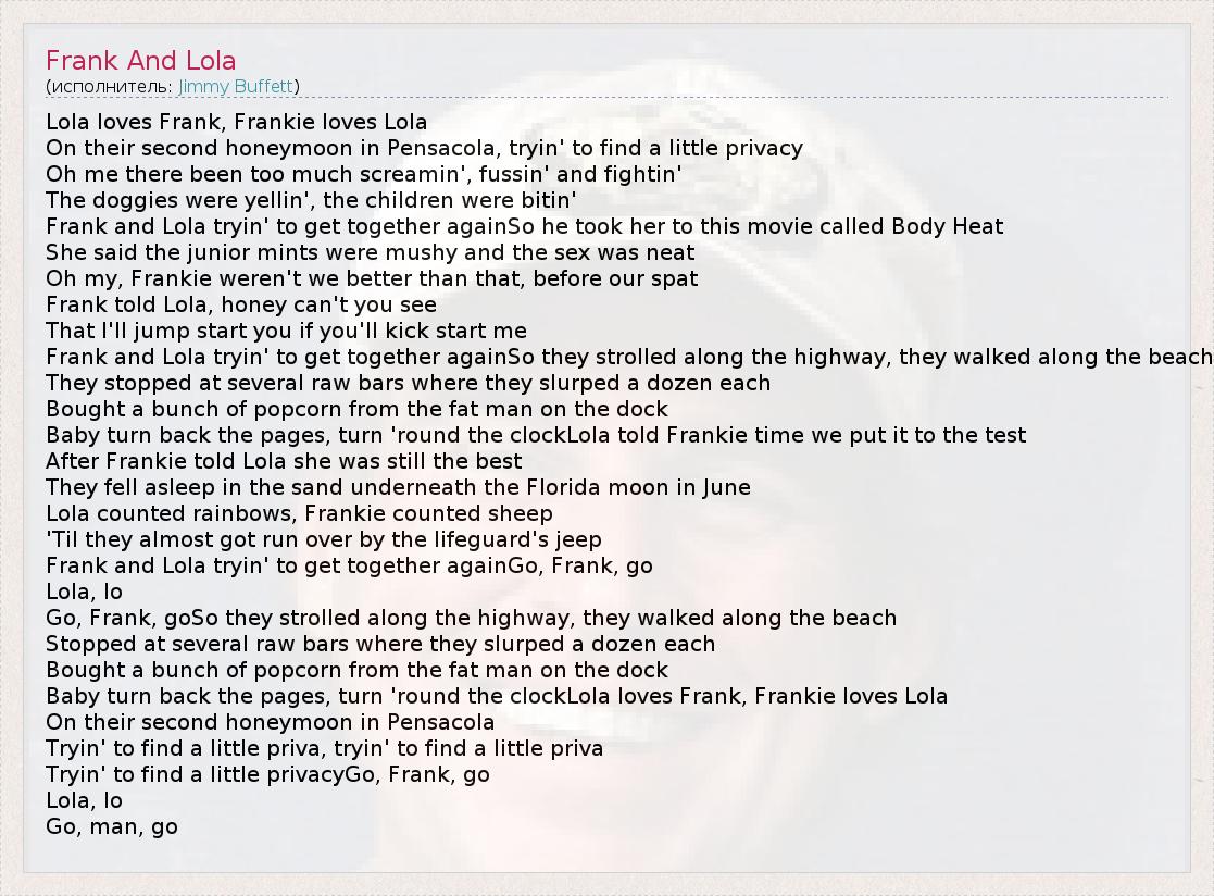 А как ты думаешь, о чем песня "Frank And Lola" ?