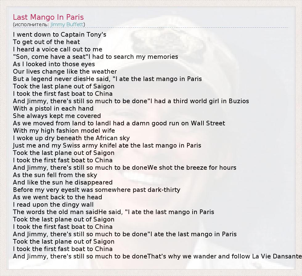 I went down to Captain Tony's To get out of the heat I heard a voice call out to me "Son, come have a seat"I had to search my memories As I looked into those eyes Our lives change like the weather But a legend never diesHe said, "I ate the last mango in Paris Took the last plane out of Saigon I took the first fast boat to China And Jimmy, there's still so much to be done"I had a third world girl in Buzios With a pistol in each hand She always kept me covered As we moved from land to landI had a damn good run on Wall Street With my high fashion model wife I woke up dry beneath the African sky Just me and my Swiss army knifeI ate the last mango in Paris Took the last plane out of Saigon I took the first fast boat to China And Jimmy, there's still so much to be doneWe shot the breeze for hours As the sun fell from the sky And like the sun he disappeared Before my very eyesIt was somewhere past dark-thirty As we went back to the head I read upon the dingy wall The words the old man saidHe said, "I ate the last mango in Paris Took the last plane out of Saigon I took the first fast boat to China And Jimmy, there's still so much to be done"I ate the last mango in Paris Took the last plane out of Saigon I took the first fast boat to China And Jimmy, there's still so much to be doneThat's why we wander and follow La Vie Dansante