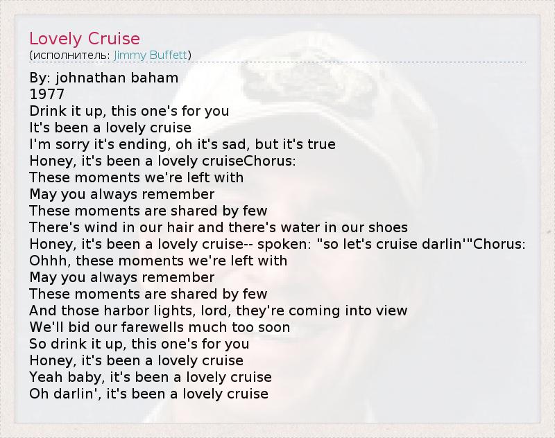 By: johnathan baham 1977 Drink it up, this one's for you It's been a lovely cruise I'm sorry it's ending, oh it's sad, but it's true Honey, it's been a lovely cruiseChorus: These moments we're left with May you always remember These moments are shared by few There's wind in our hair and there's water in our shoes Honey, it's been a lovely cruise-- spoken: "so let's cruise darlin'"Chorus: Ohhh, these moments we're left with May you always remember These moments are shared by few And those harbor lights, lord, they're coming into view We'll bid our farewells much too soon So drink it up, this one's for you Honey, it's been a lovely cruise Yeah baby, it's been a lovely cruise Oh darlin', it's been a lovely cruise