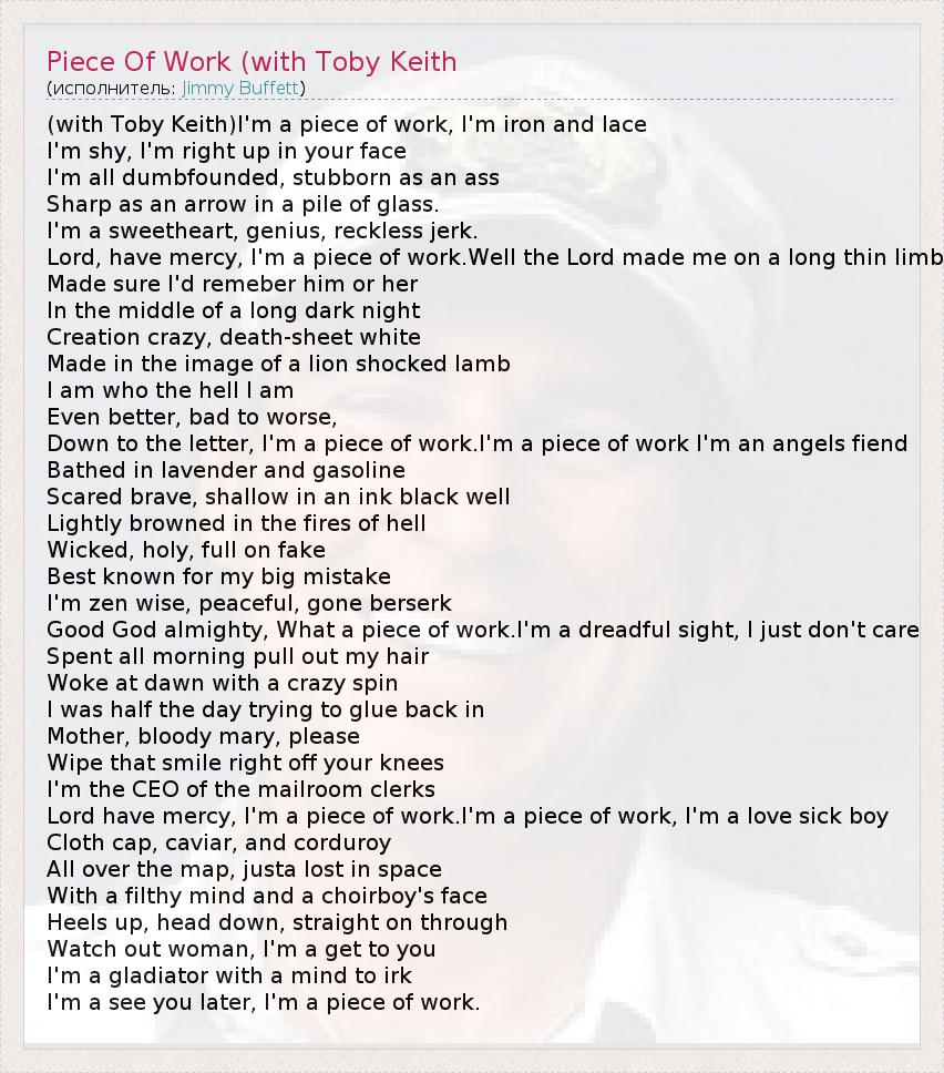 А как ты думаешь, о чем песня "Piece Of Work (with Toby Keith" ?