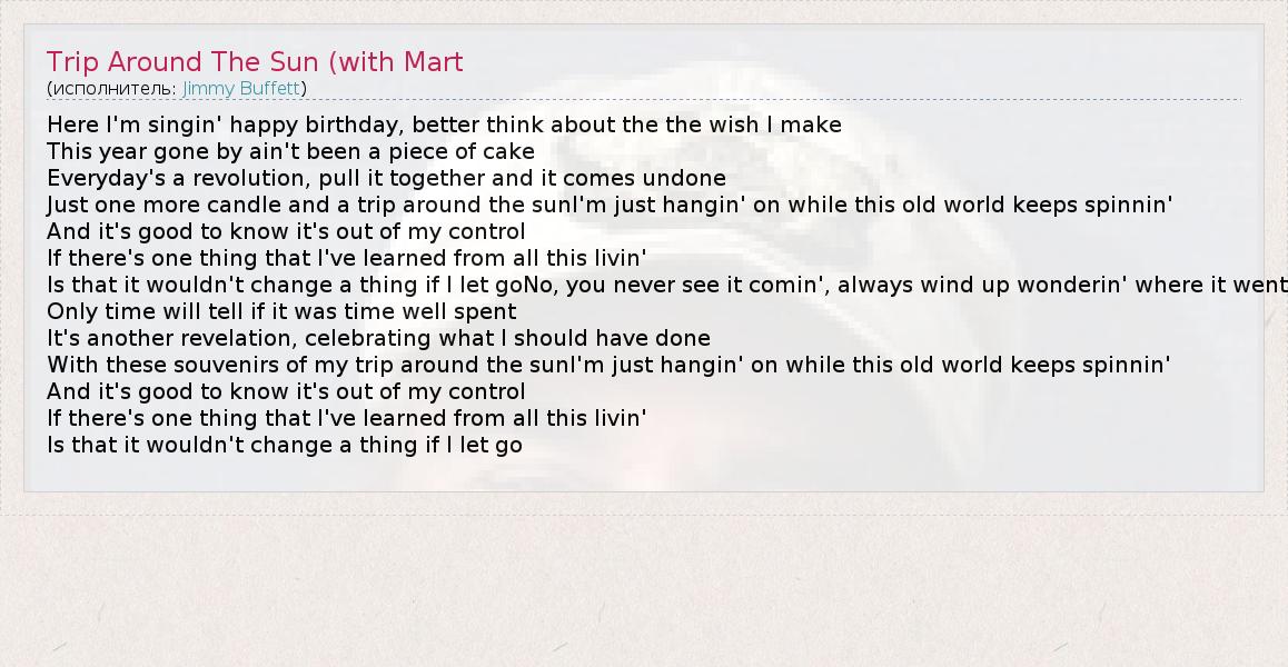ГлавнаяИсполнителиJimmy BuffettTrip Around The Sun (with Mart