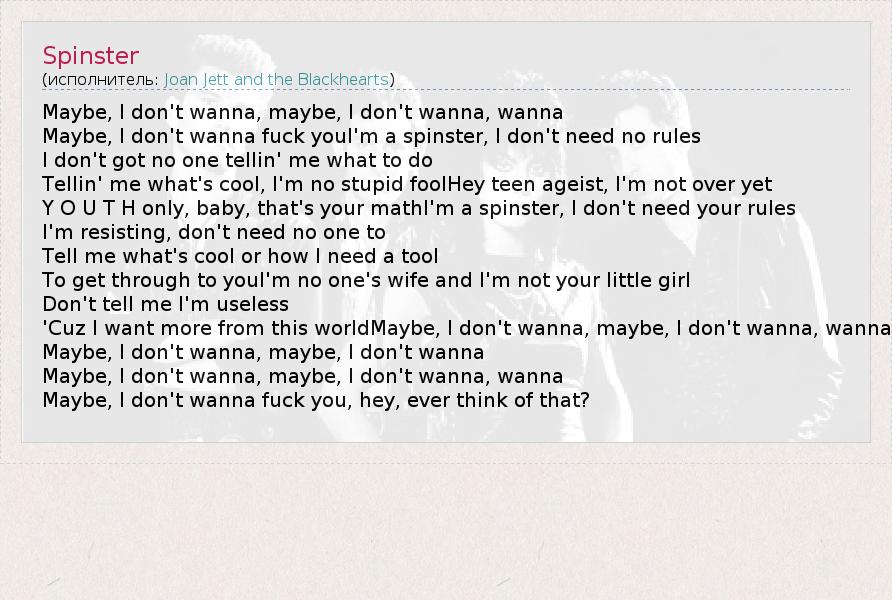 Maybe, I don't wanna fuck youI'm a spinster, I don't need no rules