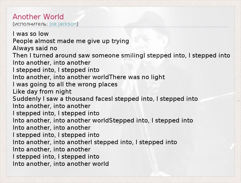 I was so low People almost made me give up trying Always said no Then I turned around saw someone smilingI stepped into, I stepped into Into another, into another I stepped into, I stepped into Into another, into another worldThere was no light I was going to all the wrong places Like day from night Suddenly I saw a thousand facesI stepped into, I stepped into Into another, into another I stepped into, I stepped into Into another, into another worldStepped into, I stepped into Into another, into another I stepped into, I stepped into Into another, into anotherI stepped into, I stepped into Into another, into another I stepped into, I stepped into Into another, into another world