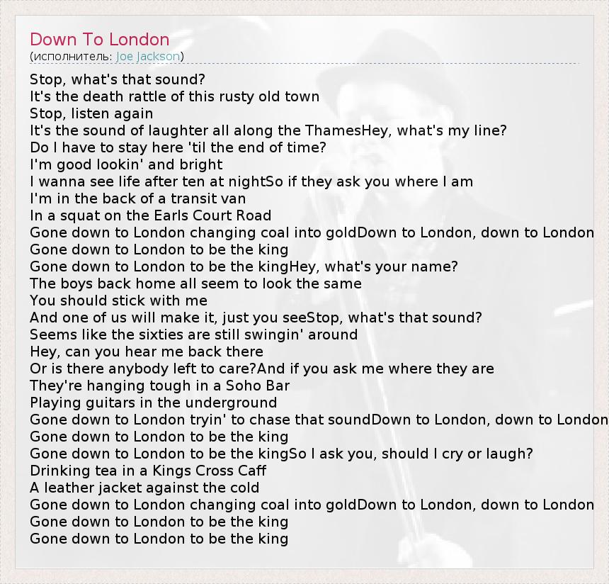 Gone down to London tryin' to chase that soundDown to London, down to London