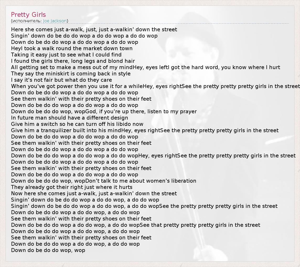Here she comes just a-walk, just, just a-walkin' down the street Singin' down do be do do wop a do do wop a do do wop Down do be do do wop a do do wop a do do wop HeyI took a walk round the market down town Taking it easy just to see what I could find I found the girls there, long legs and blond hair All getting set to make a mess out of my mindHey, eyes leftI got the hard word, you know where I hurt They say the miniskirt is coming back in style I say it's not fair but what do they care When you've got power then you use it for a whileHey, eyes rightSee the pretty pretty pretty girls in the street Down do be do do wop a do do wop a do do wop See them walkin' with their pretty shoes on their feet Down do be do do wop a do do wop a do do wop Down do be do do wop, wopGod, if you're up there, listen to my prayer In future man should have a different design Give him a switch so he can turn off his libido now Give him a tranquilizer built into his mindHey, eyes rightSee the pretty pretty pretty girls in the street Down do be do do wop a do do wop a do do wop See them walkin' with their pretty shoes on their feet Down do be do do wop a do do wop a do do wop Down do be do do wop a do do wop a do do wopHey, eyes rightSee the pretty pretty pretty girls in the street Down do be do do wop a do do wop a do do wop See them walkin' with their pretty shoes on their feet Down do be do do wop a do do wop a do do wop Down do be do do wop, wopDon't talk to me about women's liberation They already got their right just where it hurts Now here she comes just a-walk, just a-walkin' down the street Singin' down do be do do wop a do do wop, a do do wop Singin' down do be do do wop a do do wop, a do do wopSee the pretty pretty pretty girls in the street Down do be do do wop a do do wop, a do do wop See them walkin' with their pretty shoes on their feet Down do be do do wop a do do wop, a do do wopSee that pretty pretty pretty girls in the street Down do be do do wop a do do wop, a do do wop See them walkin' with their pretty shoes on their feet Down do be do do wop a do do wop, a do do wop Down do be do do wop, wop