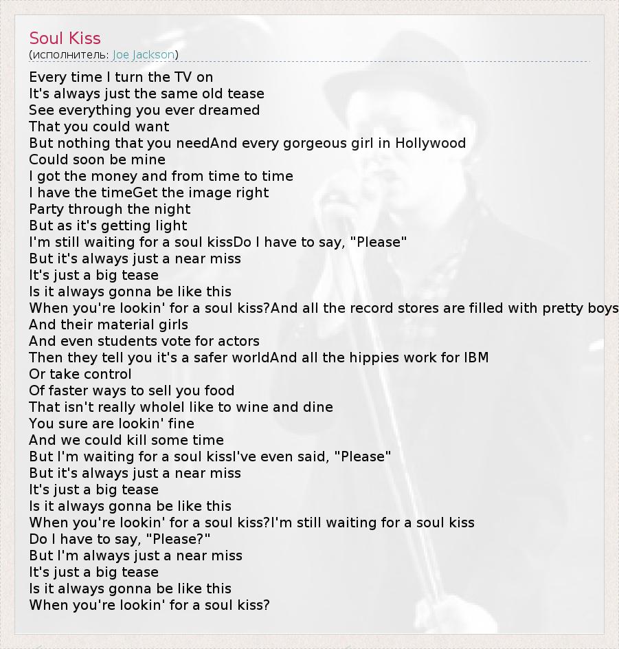 Every time I turn the TV on It's always just the same old tease See everything you ever dreamed That you could want But nothing that you needAnd every gorgeous girl in Hollywood Could soon be mine I got the money and from time to time I have the timeGet the image right Party through the night But as it's getting light I'm still waiting for a soul kissDo I have to say, "Please" But it's always just a near miss It's just a big tease Is it always gonna be like this When you're lookin' for a soul kiss?And all the record stores are filled with pretty boys And their material girls And even students vote for actors Then they tell you it's a safer worldAnd all the hippies work for IBM Or take control Of faster ways to sell you food That isn't really wholeI like to wine and dine You sure are lookin' fine And we could kill some time But I'm waiting for a soul kissI've even said, "Please" But it's always just a near miss It's just a big tease Is it always gonna be like this When you're lookin' for a soul kiss?I'm still waiting for a soul kiss Do I have to say, "Please?" But I'm always just a near miss It's just a big tease Is it always gonna be like this When you're lookin' for a soul kiss?