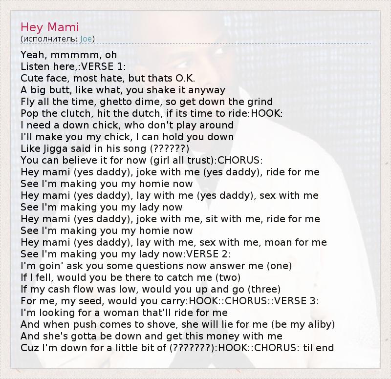 Hey mami (yes daddy), joke with me, sit with me, ride for me