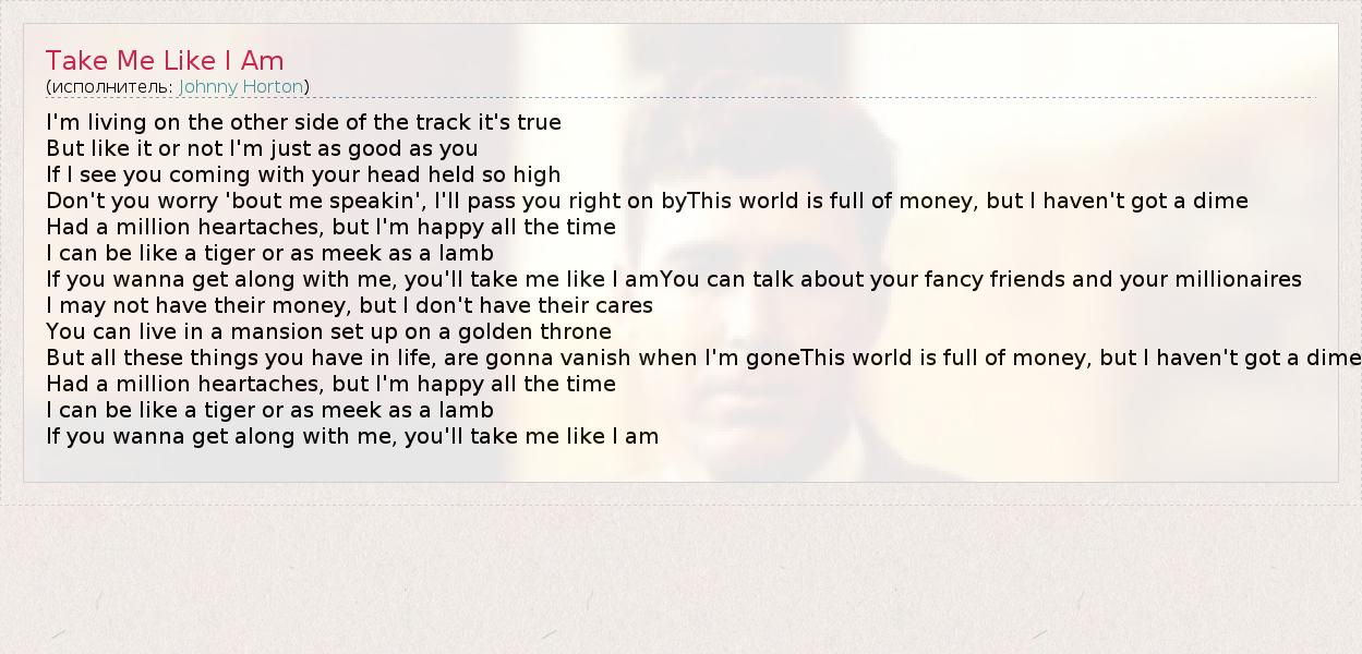 Это интересно:Джон Гейл Хортон (30 апреля 1925 г. 5 ноября 1960), известный профессионально, как Джонни Хортон, был американскую музыку кантри и рокабилли певец самый известный за его полу-фолк, так называемые "саги песни", который начал «исторической баллады "увлечение конце 1950-х и начале 1960-х. С ними у него было несколько крупных успехов, особенно в течение 1959 с песней "Битва Нового Орлеана", который... продолжение