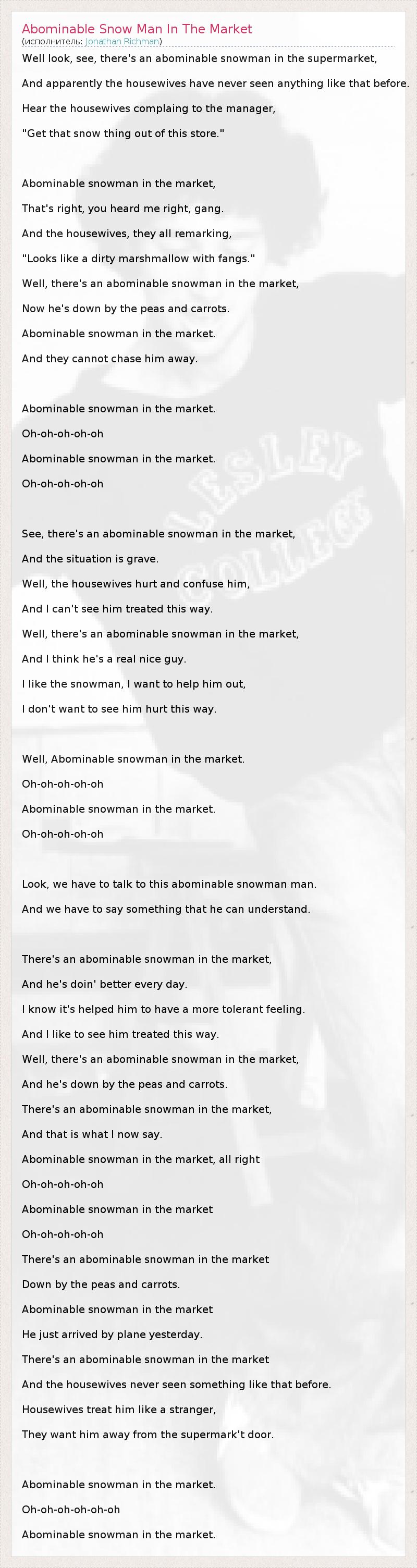 ГлавнаяИсполнителиJonathan RichmanAbominable Snow Man In The Market
