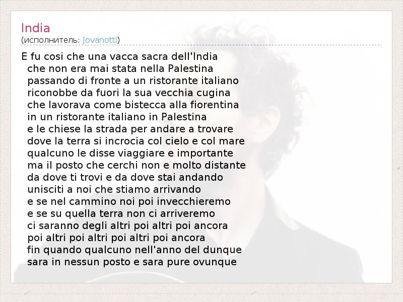 Это интересно:Jovanotti (часто пишется как Giovanotti) итальянский автор-исполнитель и рэппер. Jovanotti, чьё настоящее имя Lorenzo Cherubini, родился в Риме 27 сентября 1966 года. Его семья из Cortona, провинция Arezzo, Tuscany. 6 сентября 2008 он женился на Francesca Valiani в Cortona, в церкви Santa Maria Nuova. Их дочь Teresa родилась в 1998. Колыбельная "per te" посвященная Терезе, одна из составляющих успеха альбома Capo Horn (1999).От смеси хип-хопа, рэпа и диско... продолжение