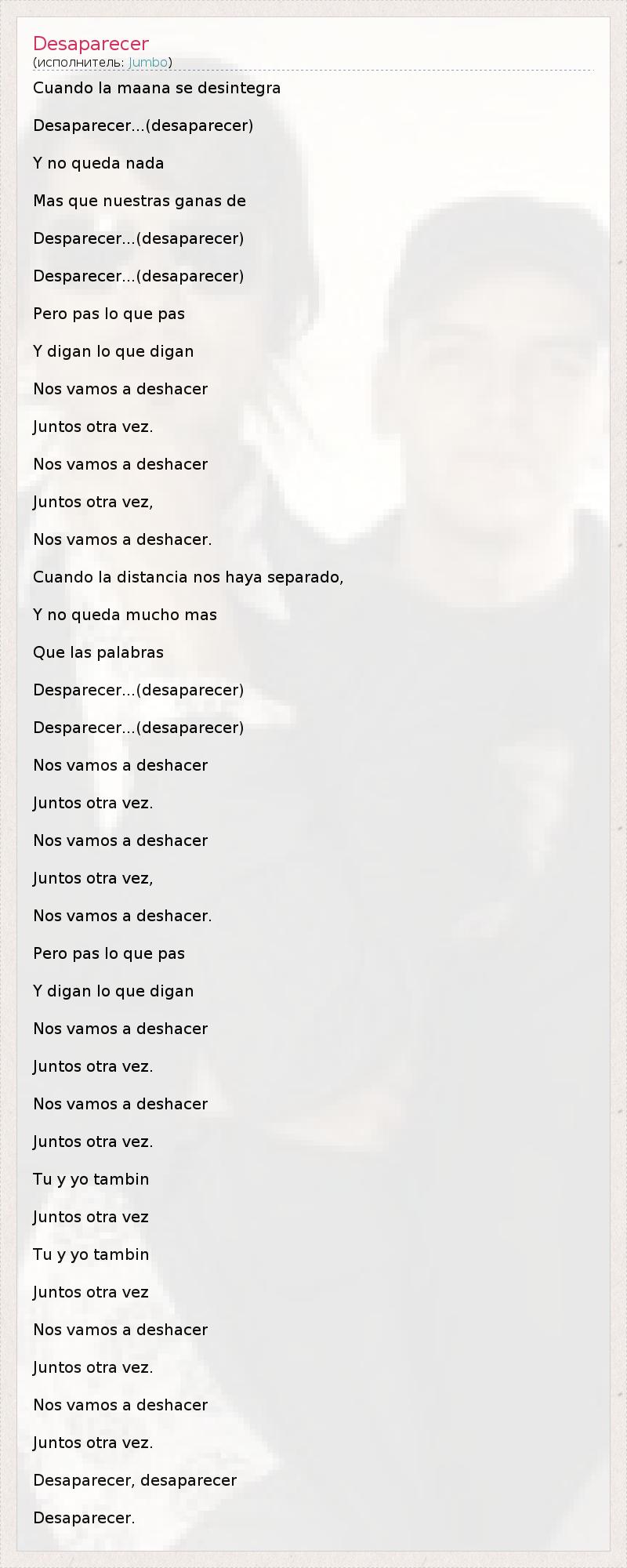 Cuando la maana se desintegra Desaparecer...(desaparecer) Y no queda nada Mas que nuestras ganas de Desparecer...(desaparecer) Desparecer...(desaparecer) Pero pas lo que pas Y digan lo que digan Nos vamos a deshacer Juntos otra vez. Nos vamos a deshacer Juntos otra vez, Nos vamos a deshacer. Cuando la distancia nos haya separado, Y no queda mucho mas Que las palabras Desparecer...(desaparecer) Desparecer...(desaparecer) Nos vamos a deshacer Juntos otra vez. Nos vamos a deshacer Juntos otra vez, Nos vamos a deshacer. Pero pas lo que pas Y digan lo que digan Nos vamos a deshacer Juntos otra vez. Nos vamos a deshacer Juntos otra vez. Tu y yo tambin Juntos otra vez Tu y yo tambin Juntos otra vez Nos vamos a deshacer Juntos otra vez. Nos vamos a deshacer Juntos otra vez. Desaparecer, desaparecer Desaparecer.