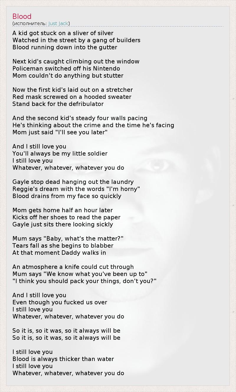 A kid got stuck on a sliver of silver Watched in the street by a gang of builders Blood running down into the gutter Next kid's caught climbing out the window Policeman switched off his Nintendo Mom couldn't do anything but stutter Now the first kid's laid out on a stretcher Red mask screwed on a hooded sweater Stand back for the defribulator And the second kid's steady four walls pacing He's thinking about the crime and the time he's facing Mom just said "I'll see you later" And I still love you You'll always be my little soldier I still love you Whatever, whatever, whatever you do Gayle stop dead hanging out the laundry Reggie's dream with the words "I'm horny" Blood drains from my face so quickly Mom gets home half an hour later Kicks off her shoes to read the paper Gayle just sits there looking sickly Mum says "Baby, what's the matter?" Tears fall as she begins to blabber At that moment Daddy walks in An atmosphere a knife could cut through Mum says "We know what you've been up to" "I think you should pack your things, don't you?" And I still love you Even though you fucked us over I still love you Whatever, whatever, whatever you do So it is, so it was, so it always will be So it is, so it was, so it always will be I still love you Blood is always thicker than water I still love you Whatever, whatever, whatever you do