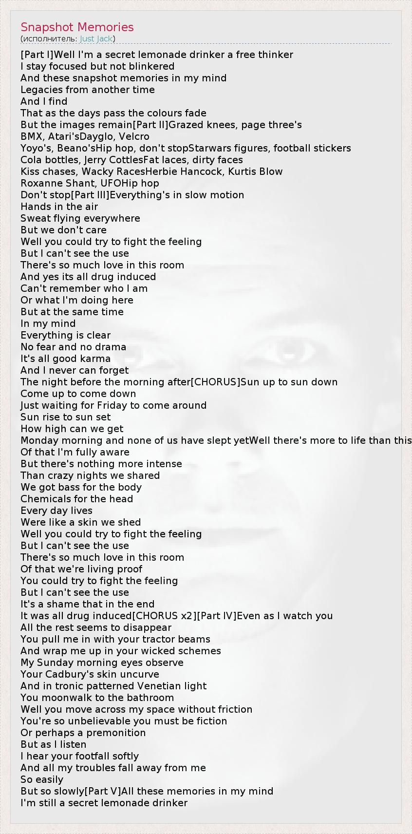 А как ты думаешь, о чем песня "Snapshot Memories" ?
