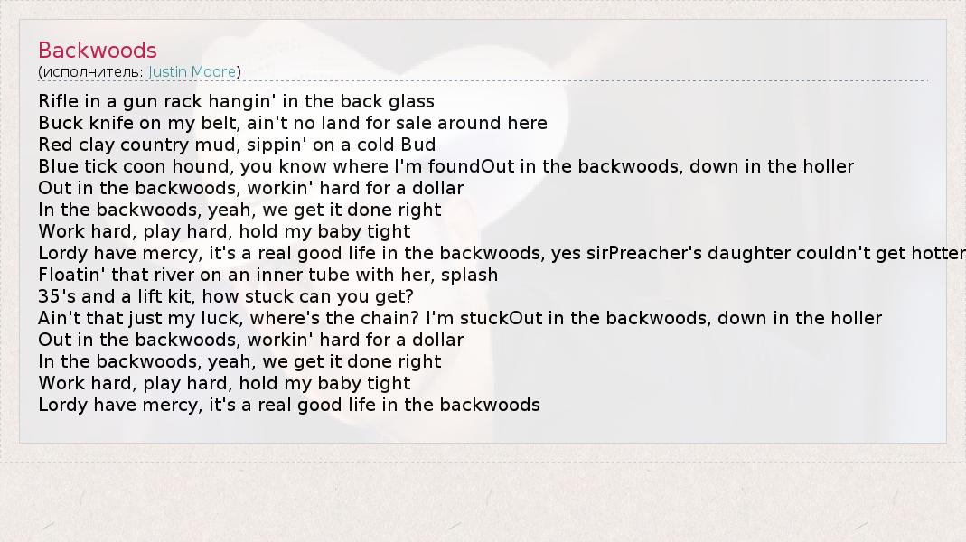 А как ты думаешь, о чем песня "Backwoods" ?
