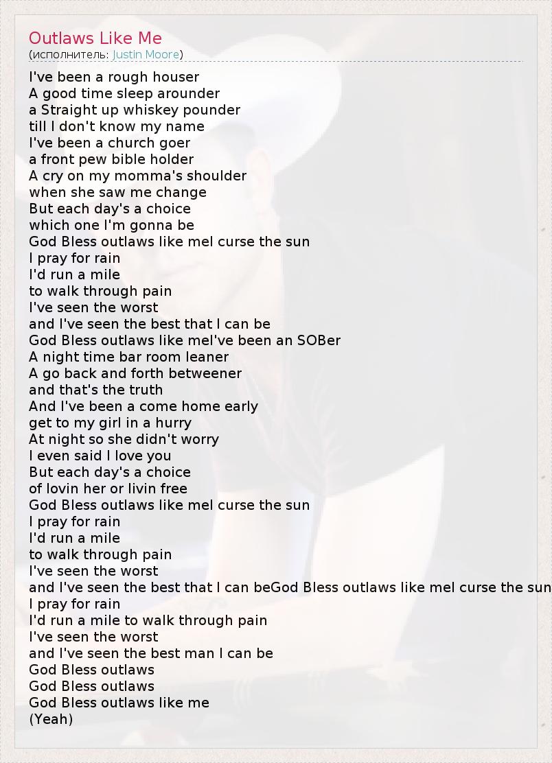 I've been a rough houser A good time sleep arounder a Straight up whiskey pounder till I don't know my name I've been a church goer a front pew bible holder A cry on my momma's shoulder when she saw me change But each day's a choice which one I'm gonna be God Bless outlaws like meI curse the sun I pray for rain I'd run a mile to walk through pain I've seen the worst and I've seen the best that I can be God Bless outlaws like meI've been an SOBer A night time bar room leaner A go back and forth betweener and that's the truth And I've been a come home early get to my girl in a hurry At night so she didn't worry I even said I love you But each day's a choice of lovin her or livin free God Bless outlaws like meI curse the sun I pray for rain I'd run a mile to walk through pain I've seen the worst and I've seen the best that I can beGod Bless outlaws like meI curse the sun I pray for rain I'd run a mile to walk through pain I've seen the worst and I've seen the best man I can be God Bless outlaws God Bless outlaws God Bless outlaws like me (Yeah)