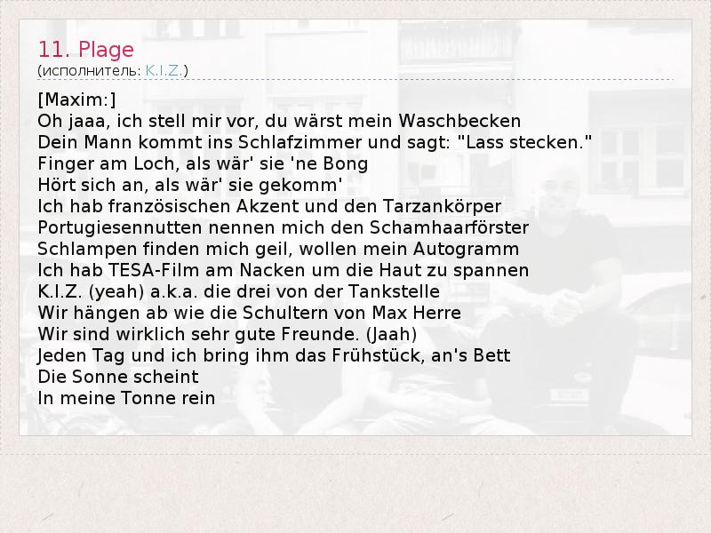 [Maxim:] Oh jaaa, ich stell mir vor, du wärst mein Waschbecken Dein Mann kommt ins Schlafzimmer und sagt: "Lass stecken." Finger am Loch, als wär' sie 'ne Bong Hört sich an, als wär' sie gekomm' Ich hab französischen Akzent und den Tarzankörper Portugiesennutten nennen mich den Schamhaarförster Schlampen finden mich geil, wollen mein Autogramm Ich hab TESA-Film am Nacken um die Haut zu spannen K.I.Z. (yeah) a.k.a. die drei von der Tankstelle Wir hängen ab wie die Schultern von Max Herre Wir sind wirklich sehr gute Freunde. (Jaah) Jeden Tag und ich bring ihm das Frühstück, an's Bett Die Sonne scheint In meine Tonne rein