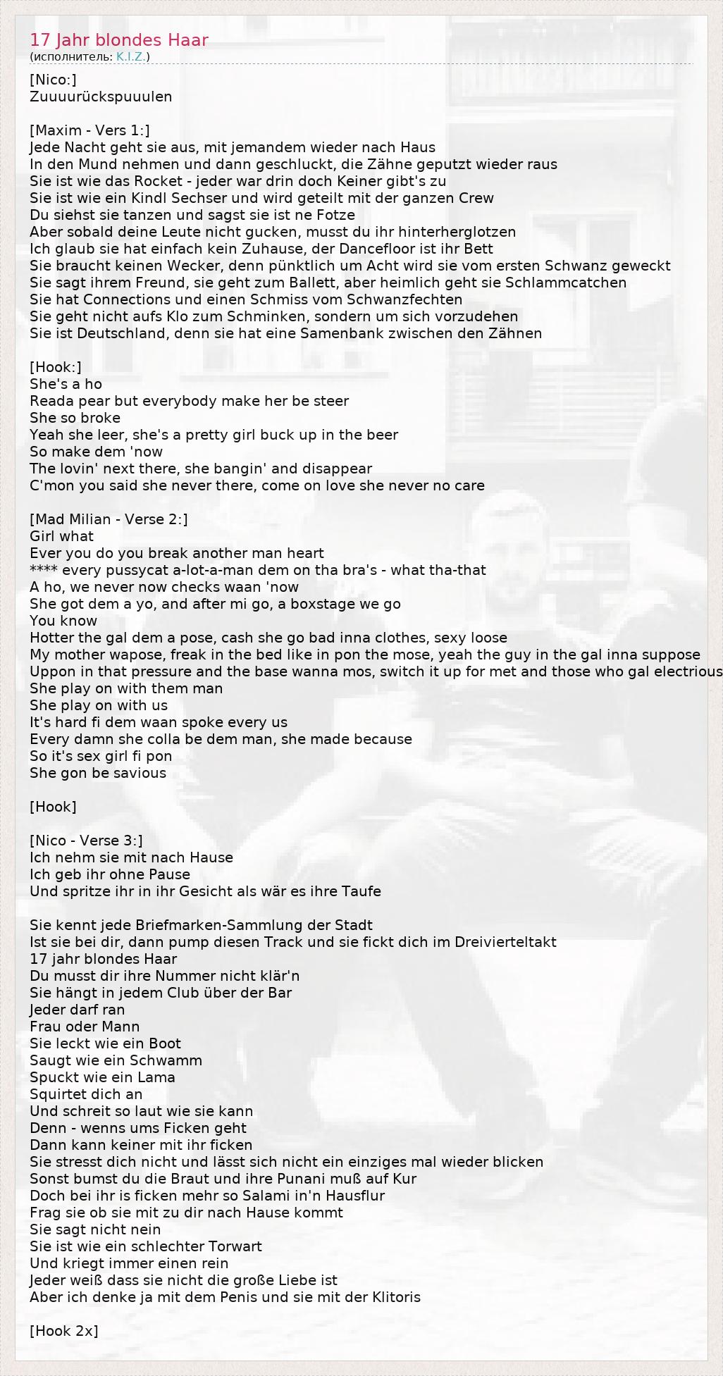 [Nico:] Zuuuurückspuuulen [Maxim - Vers 1:] Jede Nacht geht sie aus, mit jemandem wieder nach Haus In den Mund nehmen und dann geschluckt, die Zähne geputzt wieder raus Sie ist wie das Rocket - jeder war drin doch Keiner gibt's zu Sie ist wie ein Kindl Sechser und wird geteilt mit der ganzen Crew Du siehst sie tanzen und sagst sie ist ne Fotze Aber sobald deine Leute nicht gucken, musst du ihr hinterherglotzen Ich glaub sie hat einfach kein Zuhause, der Dancefloor ist ihr Bett Sie braucht keinen Wecker, denn pünktlich um Acht wird sie vom ersten Schwanz geweckt Sie sagt ihrem Freund, sie geht zum Ballett, aber heimlich geht sie Schlammcatchen Sie hat Connections und einen Schmiss vom Schwanzfechten Sie geht nicht aufs Klo zum Schminken, sondern um sich vorzudehen Sie ist Deutschland, denn sie hat eine Samenbank zwischen den Zähnen [Hook:] She's a ho Reada pear but everybody make her be steer She so broke Yeah she leer, she's a pretty girl buck up in the beer So make dem 'now The lovin' next there, she bangin' and disappear C'mon you said she never there, come on love she never no care [Mad Milian - Verse 2:] Girl what Ever you do you break another man heart **** every pussycat a-lot-a-man dem on tha bra's - what tha-that A ho, we never now checks waan 'now She got dem a yo, and after mi go, a boxstage we go You know Hotter the gal dem a pose, cash she go bad inna clothes, sexy loose My mother wapose, freak in the bed like in pon the mose, yeah the guy in the gal inna suppose Uppon in that pressure and the base wanna mos, switch it up for met and those who gal electrious She play on with them man She play on with us It's hard fi dem waan spoke every us Every damn she colla be dem man, she made because So it's sex girl fi pon She gon be savious [Hook] [Nico - Verse 3:] Ich nehm sie mit nach Hause Ich geb ihr ohne Pause Und spritze ihr in ihr Gesicht als wär es ihre Taufe Sie kennt jede Briefmarken-Sammlung der Stadt Ist sie bei dir, dann pump diesen Track und sie fickt dich im Dreivierteltakt 17 jahr blondes Haar Du musst dir ihre Nummer nicht klär'n Sie hängt in jedem Club über der Bar Jeder darf ran Frau oder Mann Sie leckt wie ein Boot Saugt wie ein Schwamm Spuckt wie ein Lama Squirtet dich an Und schreit so laut wie sie kann Denn - wenns ums Ficken geht Dann kann keiner mit ihr ficken Sie stresst dich nicht und lässt sich nicht ein einziges mal wieder blicken Sonst bumst du die Braut und ihre Punani muß auf Kur Doch bei ihr is ficken mehr so Salami in'n Hausflur Frag sie ob sie mit zu dir nach Hause kommt Sie sagt nicht nein Sie ist wie ein schlechter Torwart Und kriegt immer einen rein Jeder weiß dass sie nicht die große Liebe ist Aber ich denke ja mit dem Penis und sie mit der Klitoris [Hook 2x]