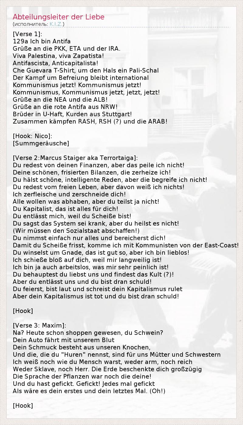 Это интересно:K.I.Z. это немецкая хип-хоп команда из Берлина. K.I.Z., по их собственному мнению, создали новый стиль немецкой рэп музыки, называя его "смесью панка и техно". Это прежде всего рэп батлы, как правило, заполненые большим количеством иронии и черного юмора. Группа состоит из четырех человек: Тарек, Максим, Нико (так известный как € 8000) и DJ Craft.Имеется несколько версий рассшифровки аббревиатуры... продолжение