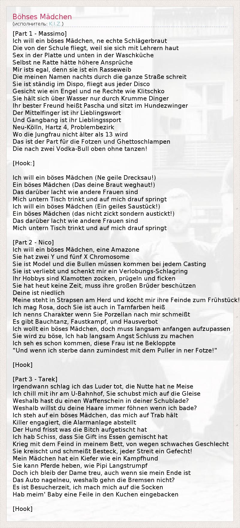 [Part 1 - Massimo] Ich will ein böses Mädchen, ne echte Schlägerbraut Die von der Schule fliegt, weil sie sich mit Lehrern haut Sex in der Platte und unten in der Waschküche Selbst ne Ratte hätte höhere Ansprüche Mir ists egal, denn sie ist ein Rasseweib Die meinen Namen nachts durch die ganze Straße schreit Sie ist ständig im Dispo, fliegt aus jeder Disco Gesicht wie ein Engel und ne Rechte wie Klitschko Sie hält sich über Wasser nur durch Krumme Dinger Ihr bester Freund heißt Pascha und sitzt im Hundezwinger Der Mittelfinger ist ihr Lieblingswort Und Gangbang ist ihr Lieblingssport Neu-Kölln, Hartz 4, Problembezirk Wo die Jungfrau nicht älter als 13 wird Das ist der Part für die Fotzen und Ghettoschlampen Die nach zwei Vodka-Bull oben ohne tanzen! [Hook:] Ich will ein böses Mädchen (Ne geile Drecksau!) Ein böses Mädchen (Das deine Braut weghaut!) Das darüber lacht wie andere Frauen sind Mich untern Tisch trinkt und auf mich drauf springt Ich will ein böses Mädchen (Ein geiles Saustück!) Ein böses Mädchen (das nicht zickt sondern austickt!) Das darüber lacht wie andere Frauen sind Mich untern Tisch trinkt und auf mich drauf springt [Part 2 - Nico] Ich will ein böses Mädchen, eine Amazone Sie hat zwei Y und fünf X Chromosome Sie ist Model und die Bullen müssen kommen bei jedem Casting Sie ist verliebt und schenkt mir ein Verlobungs-Schlagring Ihr Hobbys sind Klamotten zocken, prügeln und ficken Sie hat heut keine Zeit, muss ihre großen Brüder beschützen Deine ist niedlich Meine steht in Strapsen am Herd und kocht mir ihre Feinde zum Frühstück! Ich mag Rosa, doch Sie ist auch in Tarnfarben heiß Ich nenns Charakter wenn Sie Porzellan nach mir schmeißt Es gibt Bauchtanz, Faustkampf, und Hausverbot Ich wollt ein böses Mädchen, doch muss langsam anfangen aufzupassen Sie wird zu böse, Ich hab langsam Angst Schluss zu machen Ich seh es schon kommen, diese Frau ist ne Bekloppte "Und wenn ich sterbe dann zumindest mit dem Puller in ner Fotze!" [Hook] [Part 3 - Tarek] Irgendwann schlag ich das Luder tot, die Nutte hat ne Meise Ich chill mit ihr am U-Bahnhof, Sie schubst mich auf die Gleise Weshalb hast du einen Waffenschein in deiner Schublade? Weshalb willst du deine Haare immer föhnen wenn ich bade? Ich steh auf ein böses Mädchen, das mich auf Trab hält Killer engagiert, die Alarmanlage abstellt Der Hund frisst was die Bitch aufgetischt hat Ich hab Schiss, dass Sie Gift ins Essen gemischt hat Krieg mit dem Feind in meinem Bett, von wegen schwaches Geschlecht Sie kreischt und schmeißt Besteck, jeder Streit ein Gefecht! Mein Mädchen hat ein Kiefer wie ein Kampfhund Sie kann Pferde heben, wie Pipi Langstrumpf Doch ich bleib der Dame treu, auch wenn sie mein Ende ist Das Auto nagelneu, weshalb gehn die Bremsen nicht? Es ist Besucherzeit, ich mach mich auf die Socken Hab meim' Baby eine Feile in den Kuchen eingebacken [Hook]