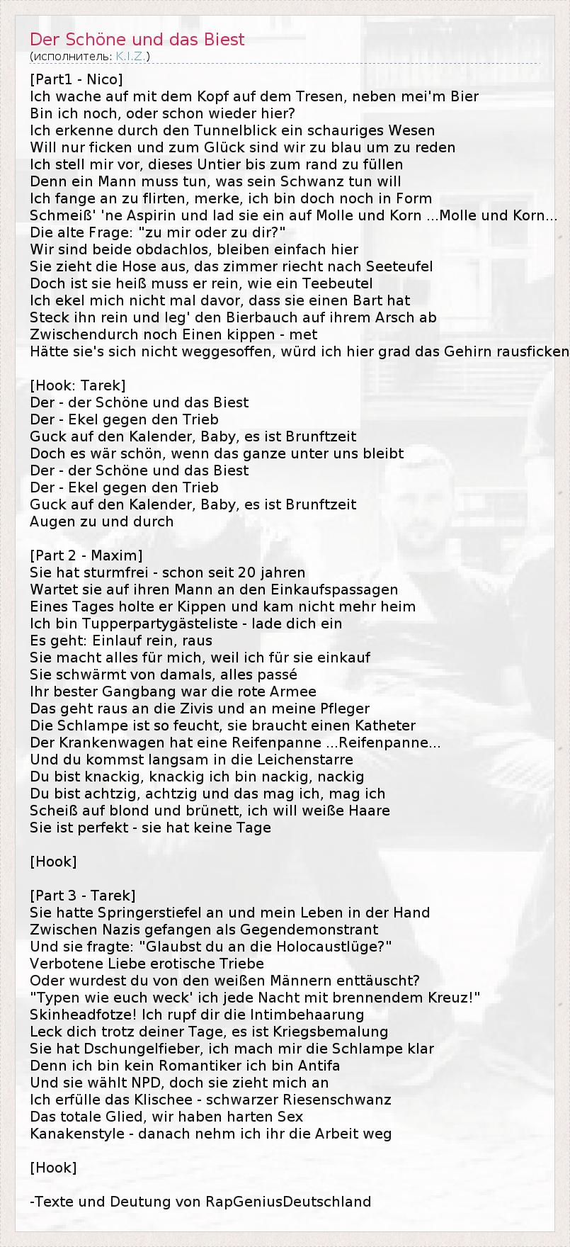 Это интересно:K.I.Z. это немецкая хип-хоп команда из Берлина. K.I.Z., по их собственному мнению, создали новый стиль немецкой рэп музыки, называя его "смесью панка и техно". Это прежде всего рэп батлы, как правило, заполненые большим количеством иронии и черного юмора. Группа состоит из четырех человек: Тарек, Максим, Нико (так известный как € 8000) и DJ Craft.Имеется несколько версий рассшифровки аббревиатуры... продолжение