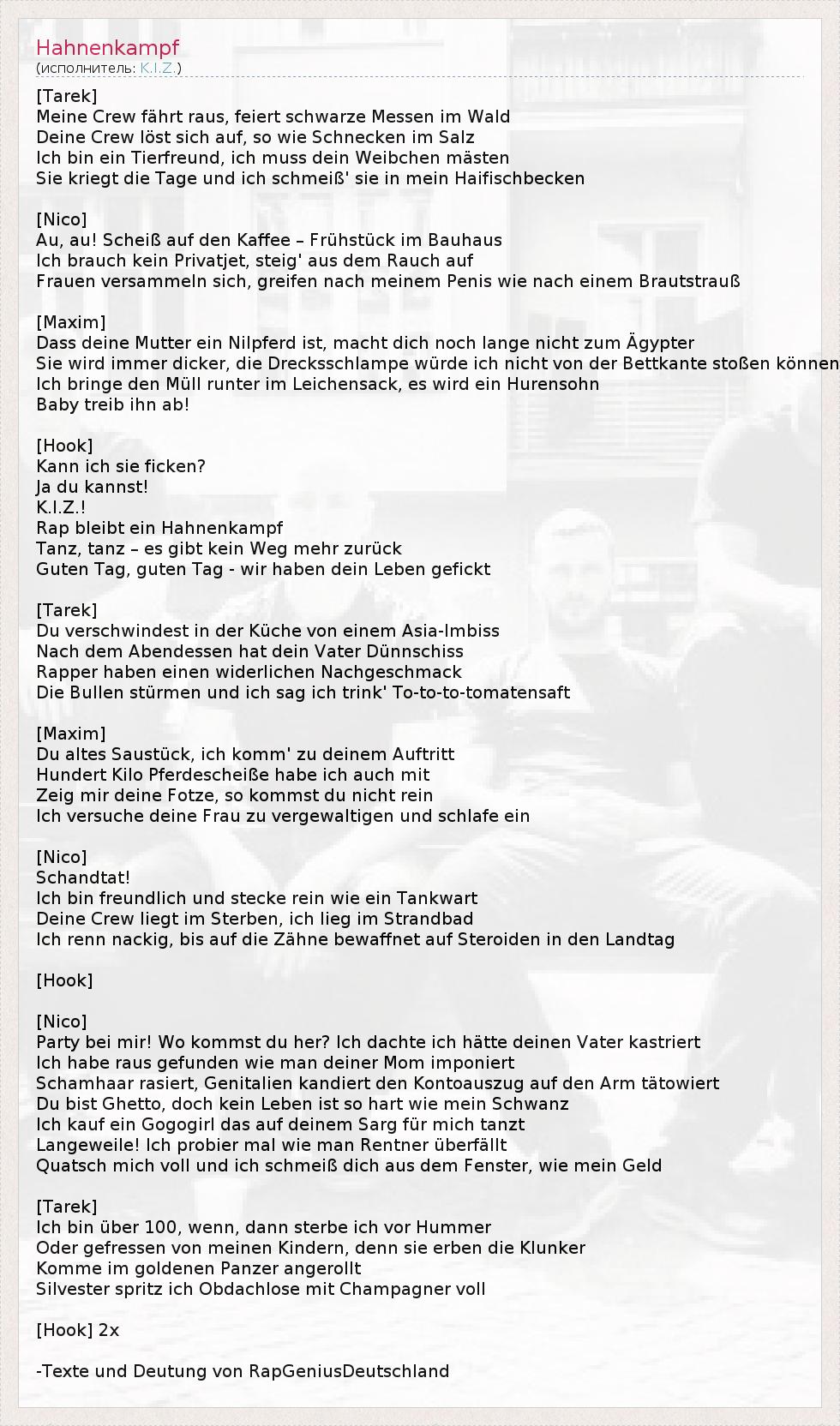 [Tarek] Meine Crew fährt raus, feiert schwarze Messen im Wald Deine Crew löst sich auf, so wie Schnecken im Salz Ich bin ein Tierfreund, ich muss dein Weibchen mästen Sie kriegt die Tage und ich schmeiß' sie in mein Haifischbecken [Nico] Au, au! Scheiß auf den Kaffee – Frühstück im Bauhaus Ich brauch kein Privatjet, steig' aus dem Rauch auf Frauen versammeln sich, greifen nach meinem Penis wie nach einem Brautstrauß [Maxim] Dass deine Mutter ein Nilpferd ist, macht dich noch lange nicht zum Ägypter Sie wird immer dicker, die Drecksschlampe würde ich nicht von der Bettkante stoßen können Ich bringe den Müll runter im Leichensack, es wird ein Hurensohn Baby treib ihn ab! [Hook] Kann ich sie ficken? Ja du kannst! K.I.Z.! Rap bleibt ein Hahnenkampf Tanz, tanz – es gibt kein Weg mehr zurück Guten Tag, guten Tag - wir haben dein Leben gefickt [Tarek] Du verschwindest in der Küche von einem Asia-Imbiss Nach dem Abendessen hat dein Vater Dünnschiss Rapper haben einen widerlichen Nachgeschmack Die Bullen stürmen und ich sag ich trink' To-to-to-tomatensaft [Maxim] Du altes Saustück, ich komm' zu deinem Auftritt Hundert Kilo Pferdescheiße habe ich auch mit Zeig mir deine Fotze, so kommst du nicht rein Ich versuche deine Frau zu vergewaltigen und schlafe ein [Nico] Schandtat! Ich bin freundlich und stecke rein wie ein Tankwart Deine Crew liegt im Sterben, ich lieg im Strandbad Ich renn nackig, bis auf die Zähne bewaffnet auf Steroiden in den Landtag [Hook] [Nico] Party bei mir! Wo kommst du her? Ich dachte ich hätte deinen Vater kastriert Ich habe raus gefunden wie man deiner Mom imponiert Schamhaar rasiert, Genitalien kandiert den Kontoauszug auf den Arm tätowiert Du bist Ghetto, doch kein Leben ist so hart wie mein Schwanz Ich kauf ein Gogogirl das auf deinem Sarg für mich tanzt Langeweile! Ich probier mal wie man Rentner überfällt Quatsch mich voll und ich schmeiß dich aus dem Fenster, wie mein Geld [Tarek] Ich bin über 100, wenn, dann sterbe ich vor Hummer Oder gefressen von meinen Kindern, denn sie erben die Klunker Komme im goldenen Panzer angerollt Silvester spritz ich Obdachlose mit Champagner voll [Hook] 2x -Texte und Deutung von RapGeniusDeutschland