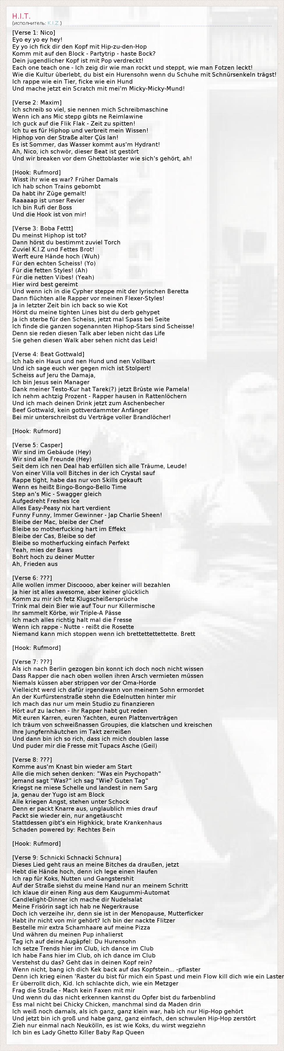 Это интересно:K.I.Z. это немецкая хип-хоп команда из Берлина. K.I.Z., по их собственному мнению, создали новый стиль немецкой рэп музыки, называя его "смесью панка и техно". Это прежде всего рэп батлы, как правило, заполненые большим количеством иронии и черного юмора. Группа состоит из четырех человек: Тарек, Максим, Нико (так известный как € 8000) и DJ Craft.Имеется несколько версий рассшифровки аббревиатуры... продолжение