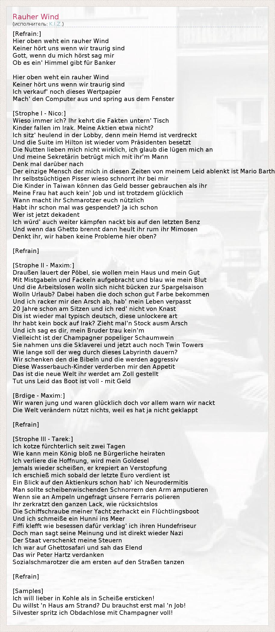 Это интересно:K.I.Z. это немецкая хип-хоп команда из Берлина. K.I.Z., по их собственному мнению, создали новый стиль немецкой рэп музыки, называя его "смесью панка и техно". Это прежде всего рэп батлы, как правило, заполненые большим количеством иронии и черного юмора. Группа состоит из четырех человек: Тарек, Максим, Нико (так известный как € 8000) и DJ Craft.Имеется несколько версий рассшифровки аббревиатуры... продолжение