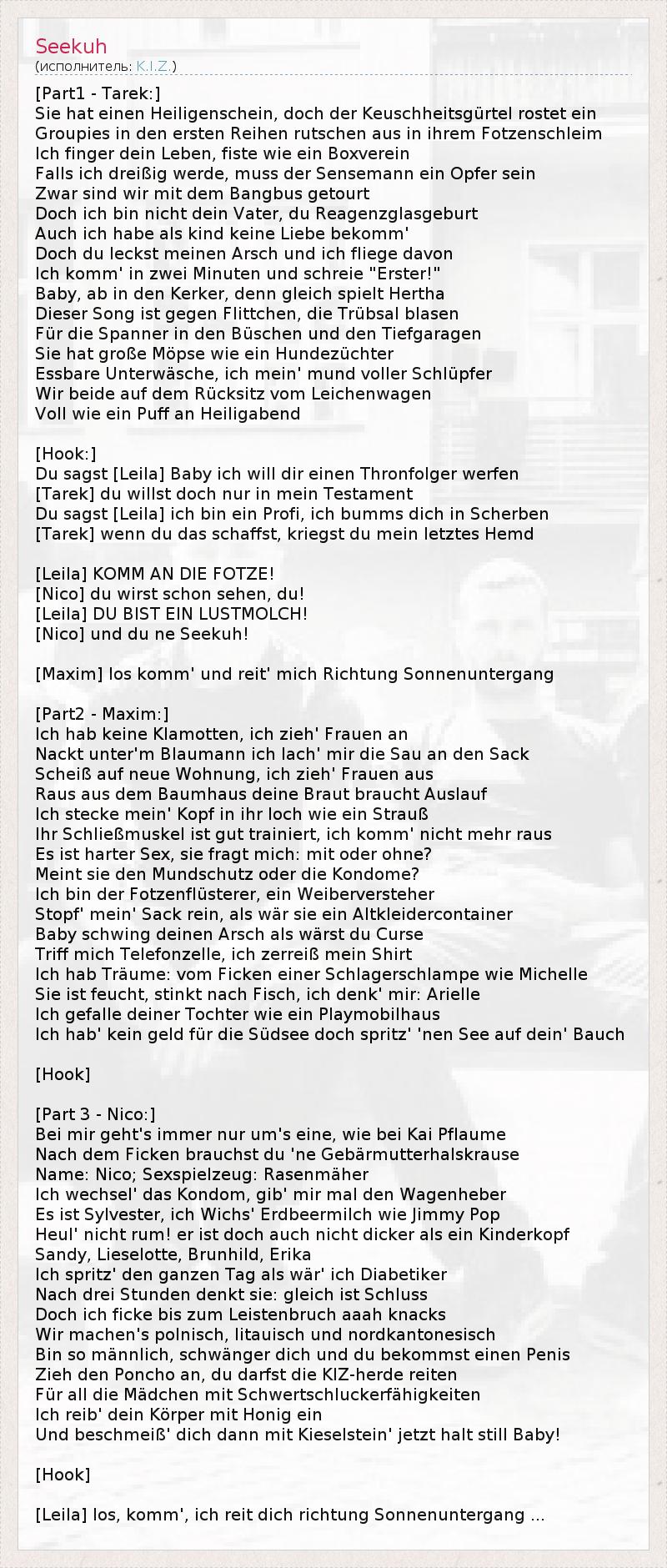 [Part1 - Tarek:] Sie hat einen Heiligenschein, doch der Keuschheitsgürtel rostet ein Groupies in den ersten Reihen rutschen aus in ihrem Fotzenschleim Ich finger dein Leben, fiste wie ein Boxverein Falls ich dreißig werde, muss der Sensemann ein Opfer sein Zwar sind wir mit dem Bangbus getourt Doch ich bin nicht dein Vater, du Reagenzglasgeburt Auch ich habe als kind keine Liebe bekomm' Doch du leckst meinen Arsch und ich fliege davon Ich komm' in zwei Minuten und schreie "Erster!" Baby, ab in den Kerker, denn gleich spielt Hertha Dieser Song ist gegen Flittchen, die Trübsal blasen Für die Spanner in den Büschen und den Tiefgaragen Sie hat große Möpse wie ein Hundezüchter Essbare Unterwäsche, ich mein' mund voller Schlüpfer Wir beide auf dem Rücksitz vom Leichenwagen Voll wie ein Puff an Heiligabend [Hook:] Du sagst [Leila] Baby ich will dir einen Thronfolger werfen [Tarek] du willst doch nur in mein Testament Du sagst [Leila] ich bin ein Profi, ich bumms dich in Scherben [Tarek] wenn du das schaffst, kriegst du mein letztes Hemd [Leila] KOMM AN DIE FOTZE! [Nico] du wirst schon sehen, du! [Leila] DU BIST EIN LUSTMOLCH! [Nico] und du ne Seekuh! [Maxim] los komm' und reit' mich Richtung Sonnenuntergang [Part2 - Maxim:] Ich hab keine Klamotten, ich zieh' Frauen an Nackt unter'm Blaumann ich lach' mir die Sau an den Sack Scheiß auf neue Wohnung, ich zieh' Frauen aus Raus aus dem Baumhaus deine Braut braucht Auslauf Ich stecke mein' Kopf in ihr loch wie ein Strauß Ihr Schließmuskel ist gut trainiert, ich komm' nicht mehr raus Es ist harter Sex, sie fragt mich: mit oder ohne? Meint sie den Mundschutz oder die Kondome? Ich bin der Fotzenflüsterer, ein Weiberversteher Stopf' mein' Sack rein, als wär sie ein Altkleidercontainer Baby schwing deinen Arsch als wärst du Curse Triff mich Telefonzelle, ich zerreiß mein Shirt Ich hab Träume: vom Ficken einer Schlagerschlampe wie Michelle Sie ist feucht, stinkt nach Fisch, ich denk' mir: Arielle Ich gefalle deiner Tochter wie ein Playmobilhaus Ich hab' kein geld für die Südsee doch spritz' 'nen See auf dein' Bauch [Hook] [Part 3 - Nico:] Bei mir geht's immer nur um's eine, wie bei Kai Pflaume Nach dem Ficken brauchst du 'ne Gebärmutterhalskrause Name: Nico; Sexspielzeug: Rasenmäher Ich wechsel' das Kondom, gib' mir mal den Wagenheber Es ist Sylvester, ich Wichs' Erdbeermilch wie Jimmy Pop Heul' nicht rum! er ist doch auch nicht dicker als ein Kinderkopf Sandy, Lieselotte, Brunhild, Erika Ich spritz' den ganzen Tag als wär' ich Diabetiker Nach drei Stunden denkt sie: gleich ist Schluss Doch ich ficke bis zum Leistenbruch aaah knacks Wir machen's polnisch, litauisch und nordkantonesisch Bin so männlich, schwänger dich und du bekommst einen Penis Zieh den Poncho an, du darfst die KIZ-herde reiten Für all die Mädchen mit Schwertschluckerfähigkeiten Ich reib' dein Körper mit Honig ein Und beschmeiß' dich dann mit Kieselstein' jetzt halt still Baby! [Hook] [Leila] los, komm', ich reit dich richtung Sonnenuntergang ...