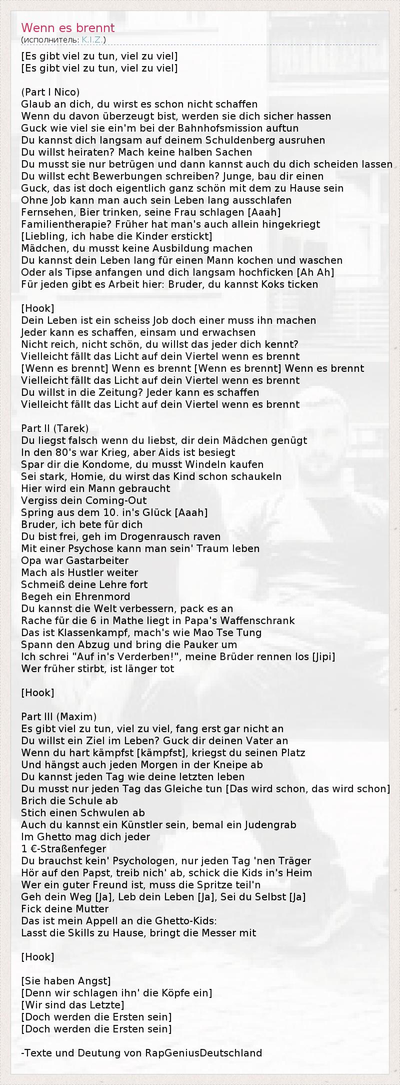 [Es gibt viel zu tun, viel zu viel] [Es gibt viel zu tun, viel zu viel] (Part I Nico) Glaub an dich, du wirst es schon nicht schaffen Wenn du davon überzeugt bist, werden sie dich sicher hassen Guck wie viel sie ein'm bei der Bahnhofsmission auftun Du kannst dich langsam auf deinem Schuldenberg ausruhen Du willst heiraten? Mach keine halben Sachen Du musst sie nur betrügen und dann kannst auch du dich scheiden lassen Du willst echt Bewerbungen schreiben? Junge, bau dir einen Guck, das ist doch eigentlich ganz schön mit dem zu Hause sein Ohne Job kann man auch sein Leben lang ausschlafen Fernsehen, Bier trinken, seine Frau schlagen [Aaah] Familientherapie? Früher hat man's auch allein hingekriegt [Liebling, ich habe die Kinder erstickt] Mädchen, du musst keine Ausbildung machen Du kannst dein Leben lang für einen Mann kochen und waschen Oder als Tipse anfangen und dich langsam hochficken [Ah Ah] Für jeden gibt es Arbeit hier: Bruder, du kannst Koks ticken [Hook] Dein Leben ist ein scheiss Job doch einer muss ihn machen Jeder kann es schaffen, einsam und erwachsen Nicht reich, nicht schön, du willst das jeder dich kennt? Vielleicht fällt das Licht auf dein Viertel wenn es brennt [Wenn es brennt] Wenn es brennt [Wenn es brennt] Wenn es brennt Vielleicht fällt das Licht auf dein Viertel wenn es brennt Du willst in die Zeitung? Jeder kann es schaffen Vielleicht fällt das Licht auf dein Viertel wenn es brennt Part II (Tarek) Du liegst falsch wenn du liebst, dir dein Mädchen genügt In den 80's war Krieg, aber Aids ist besiegt Spar dir die Kondome, du musst Windeln kaufen Sei stark, Homie, du wirst das Kind schon schaukeln Hier wird ein Mann gebraucht Vergiss dein Coming-Out Spring aus dem 10. in's Glück [Aaah] Bruder, ich bete für dich Du bist frei, geh im Drogenrausch raven Mit einer Psychose kann man sein' Traum leben Opa war Gastarbeiter Mach als Hustler weiter Schmeiß deine Lehre fort Begeh ein Ehrenmord Du kannst die Welt verbessern, pack es an Rache für die 6 in Mathe liegt in Papa's Waffenschrank Das ist Klassenkampf, mach's wie Mao Tse Tung Spann den Abzug und bring die Pauker um Ich schrei "Auf in's Verderben!", meine Brüder rennen los [Jipi] Wer früher stirbt, ist länger tot [Hook] Part III (Maxim) Es gibt viel zu tun, viel zu viel, fang erst gar nicht an Du willst ein Ziel im Leben? Guck dir deinen Vater an Wenn du hart kämpfst [kämpfst], kriegst du seinen Platz Und hängst auch jeden Morgen in der Kneipe ab Du kannst jeden Tag wie deine letzten leben Du musst nur jeden Tag das Gleiche tun [Das wird schon, das wird schon] Brich die Schule ab Stich einen Schwulen ab Auch du kannst ein Künstler sein, bemal ein Judengrab Im Ghetto mag dich jeder 1 €-Straßenfeger Du brauchst kein' Psychologen, nur jeden Tag 'nen Träger Hör auf den Papst, treib nich' ab, schick die Kids in's Heim Wer ein guter Freund ist, muss die Spritze teil'n Geh dein Weg [Ja], Leb dein Leben [Ja], Sei du Selbst [Ja] Fick deine Mutter Das ist mein Appell an die Ghetto-Kids: Lasst die Skills zu Hause, bringt die Messer mit [Hook] [Sie haben Angst] [Denn wir schlagen ihn' die Köpfe ein] [Wir sind das Letzte] [Doch werden die Ersten sein] [Doch werden die Ersten sein] -Texte und Deutung von RapGeniusDeutschland