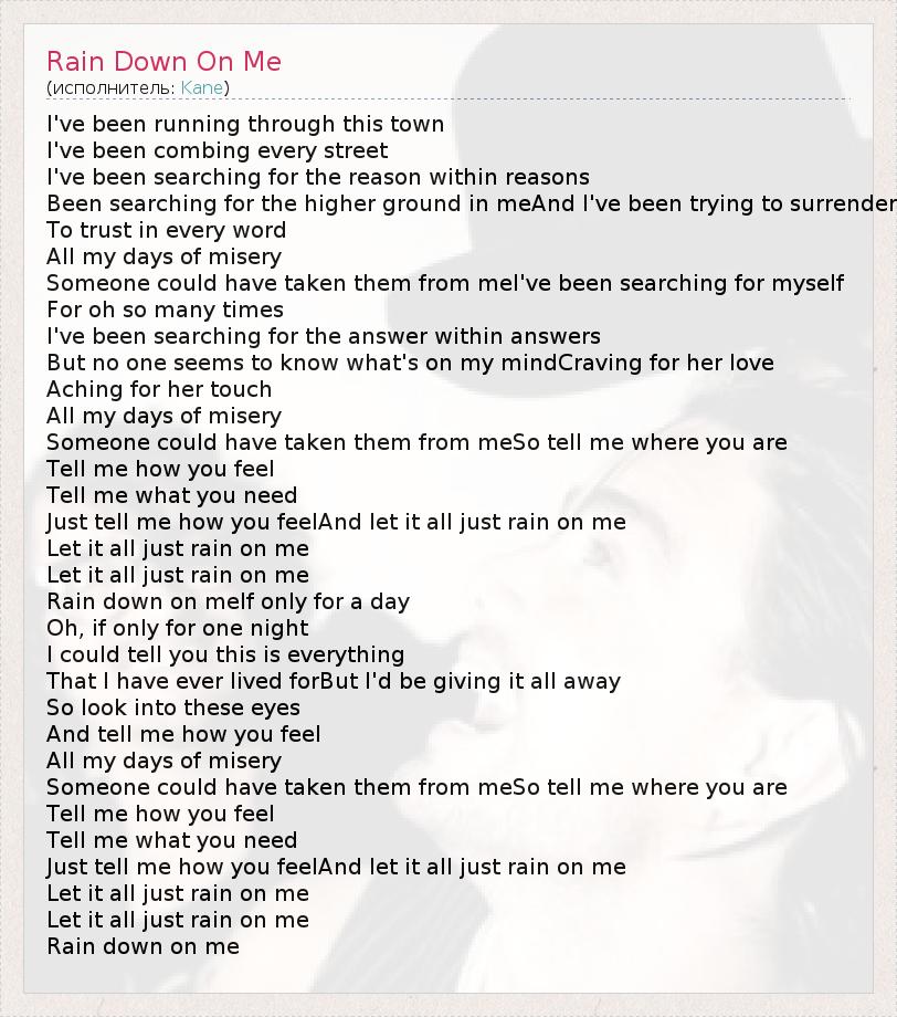 I've been running through this town I've been combing every street I've been searching for the reason within reasons Been searching for the higher ground in meAnd I've been trying to surrender To trust in every word All my days of misery Someone could have taken them from meI've been searching for myself For oh so many times I've been searching for the answer within answers But no one seems to know what's on my mindCraving for her love Aching for her touch All my days of misery Someone could have taken them from meSo tell me where you are Tell me how you feel Tell me what you need Just tell me how you feelAnd let it all just rain on me Let it all just rain on me Let it all just rain on me Rain down on meIf only for a day Oh, if only for one night I could tell you this is everything That I have ever lived forBut I'd be giving it all away So look into these eyes And tell me how you feel All my days of misery Someone could have taken them from meSo tell me where you are Tell me how you feel Tell me what you need Just tell me how you feelAnd let it all just rain on me Let it all just rain on me Let it all just rain on me Rain down on me