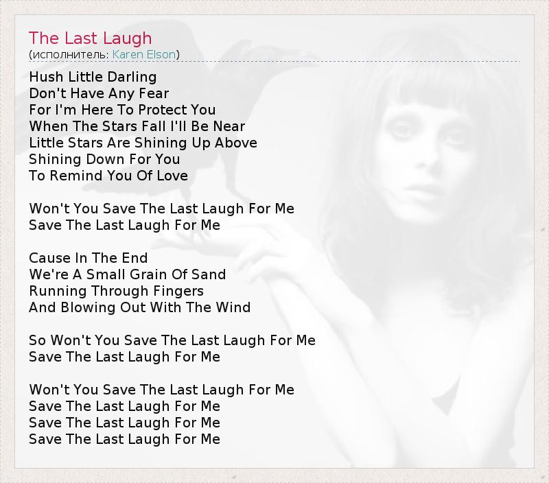 Hush Little Darling Don't Have Any Fear For I'm Here To Protect You When The Stars Fall I'll Be Near Little Stars Are Shining Up Above Shining Down For You To Remind You Of Love Won't You Save The Last Laugh For Me Save The Last Laugh For Me Cause In The End We're A Small Grain Of Sand Running Through Fingers And Blowing Out With The Wind So Won't You Save The Last Laugh For Me Save The Last Laugh For Me Won't You Save The Last Laugh For Me Save The Last Laugh For Me Save The Last Laugh For Me Save The Last Laugh For Me