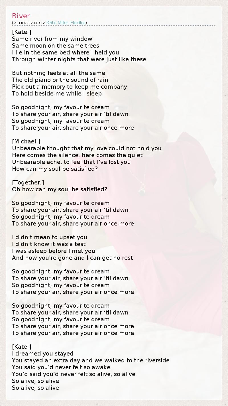 [Кейт:] Та же река видна из моего окна. Та же луна на тех же деревьях. Я лежу на той же кровати, где обнимала тебя Зимними ночами – точно такими же, как эти. Но ничто не кажется прежним, Ни старое пианино, ни звук дождя. Я возрождаю воспоминания, чтобы не оставаться одной, Чтобы окружить себя ими, пока я засыпаю. Что ж, спокойной ночи, моя любимая мечта Дышать с тобой одним воздухом, дышать с тобой одним воздухом до зари. Что ж, спокойной ночи, моя любимая мечта Вдохнуть один воздух с тобой, вдохнуть один воздух с тобой ещё раз. [Майкл:] Невыносима мысль о том, что моя любовь не могла удержать тебя. Наступает молчание, надвигается тишина. Невыносимо больно чувствовать, что я потерял тебя. Как моей душе найти утешение? [Вместе:] О, как моей душе найти утешение? Что ж, спокойной ночи, моя любимая мечта Дышать с тобой одним воздухом, дышать с тобой одним воздухом до зари. Что ж, спокойной ночи, моя любимая мечта Вдохнуть один воздух с тобой, вдохнуть один воздух с тобой ещё раз. Я не хотел(а) расстроить тебя. Я не знал(а), что это было испытание. Я спал(а) до встречи с тобой. А теперь тебя нет – и мне нет покоя. Что ж, спокойной ночи, моя любимая мечта Дышать с тобой одним воздухом, дышать с тобой одним воздухом до зари. Что ж, спокойной ночи, моя любимая мечта Вдохнуть один воздух с тобой, вдохнуть один воздух с тобой ещё раз. Что ж, спокойной ночи, моя любимая мечта Дышать с тобой одним воздухом, дышать с тобой одним воздухом до зари. Что ж, спокойной ночи, моя любимая мечта Вдохнуть один воздух с тобой, вдохнуть один воздух с тобой ещё раз, Вдохнуть один воздух с тобой, вдохнуть один воздух с тобой ещё раз. [Кейт:] Мне снилось, что ты остался, Ты остался ещё на один день, и мы ходили на берег реки. Ты сказал, что никогда не чувствовал такой ясности бытия. Ты сказал, что никогда не чувствовал себя таким живым, таким живым. Таким живым, таким живым. Таким живым, таким живым.