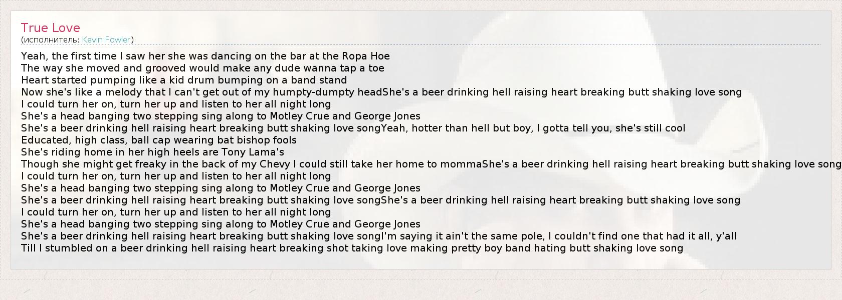 She's a beer drinking hell raising heart breaking butt shaking love songShe's a beer drinking hell raising heart breaking butt shaking love song