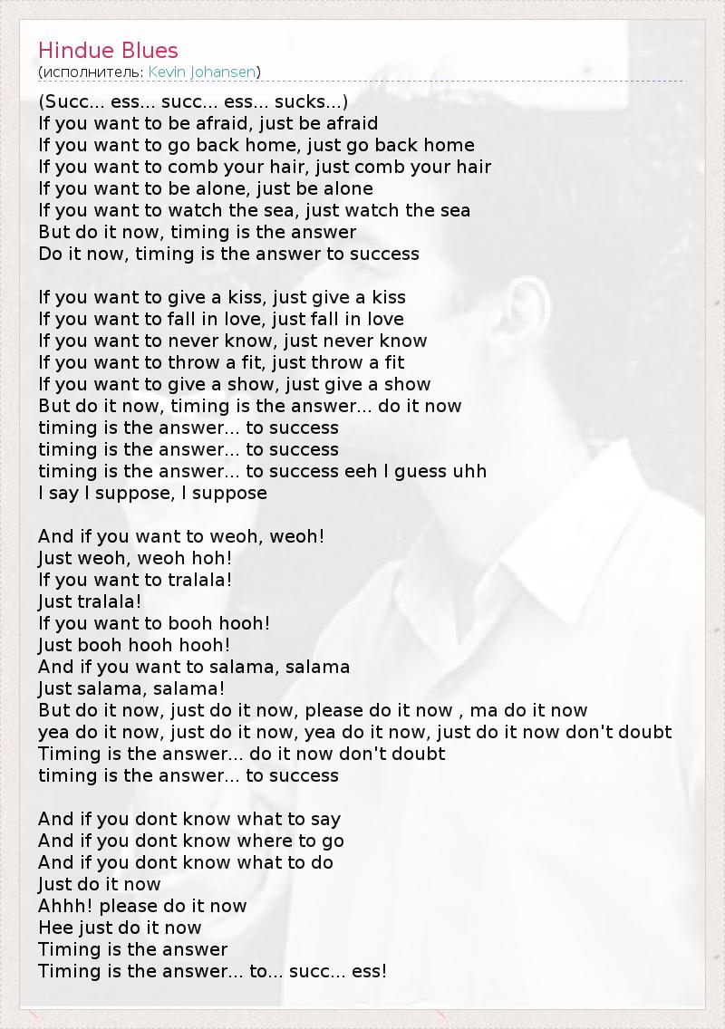 (Succ... ess... succ... ess... sucks...) If you want to be afraid, just be afraid If you want to go back home, just go back home If you want to comb your hair, just comb your hair If you want to be alone, just be alone If you want to watch the sea, just watch the sea But do it now, timing is the answer Do it now, timing is the answer to success If you want to give a kiss, just give a kiss If you want to fall in love, just fall in love If you want to never know, just never know If you want to throw a fit, just throw a fit If you want to give a show, just give a show But do it now, timing is the answer... do it now timing is the answer... to success timing is the answer... to success timing is the answer... to success eeh I guess uhh I say I suppose, I suppose And if you want to weoh, weoh! Just weoh, weoh hoh! If you want to tralala! Just tralala! If you want to booh hooh! Just booh hooh hooh! And if you want to salama, salama Just salama, salama! But do it now, just do it now, please do it now , ma do it now yea do it now, just do it now, yea do it now, just do it now don't doubt Timing is the answer... do it now don't doubt timing is the answer... to success And if you dont know what to say And if you dont know where to go And if you dont know what to do Just do it now Ahhh! please do it now Hee just do it now Timing is the answer Timing is the answer... to... succ... ess!