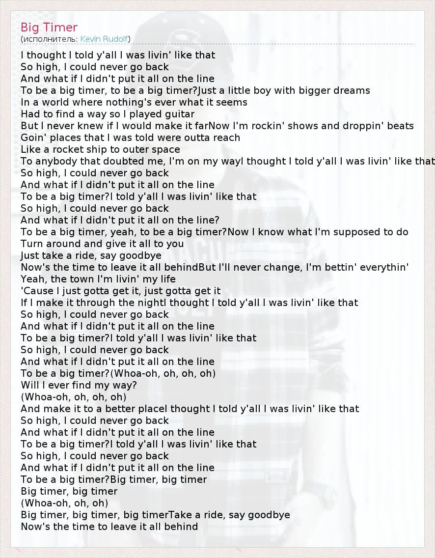 I thought I told y'all I was livin' like that So high, I could never go back And what if I didn't put it all on the line To be a big timer, to be a big timer?Just a little boy with bigger dreams In a world where nothing's ever what it seems Had to find a way so I played guitar But I never knew if I would make it farNow I'm rockin' shows and droppin' beats Goin' places that I was told were outta reach Like a rocket ship to outer space To anybody that doubted me, I'm on my wayI thought I told y'all I was livin' like that So high, I could never go back And what if I didn't put it all on the line To be a big timer?I told y'all I was livin' like that So high, I could never go back And what if I didn't put it all on the line? To be a big timer, yeah, to be a big timer?Now I know what I'm supposed to do Turn around and give it all to you Just take a ride, say goodbye Now's the time to leave it all behindBut I'll never change, I'm bettin' everythin' Yeah, the town I'm livin' my life 'Cause I just gotta get it, just gotta get it If I make it through the nightI thought I told y'all I was livin' like that So high, I could never go back And what if I didn't put it all on the line To be a big timer?I told y'all I was livin' like that So high, I could never go back And what if I didn't put it all on the line To be a big timer?(Whoa-oh, oh, oh, oh) Will I ever find my way? (Whoa-oh, oh, oh, oh) And make it to a better placeI thought I told y'all I was livin' like that So high, I could never go back And what if I didn't put it all on the line To be a big timer?I told y'all I was livin' like that So high, I could never go back And what if I didn't put it all on the line To be a big timer?Big timer, big timer Big timer, big timer (Whoa-oh, oh, oh) Big timer, big timer, big timerTake a ride, say goodbye Now's the time to leave it all behind