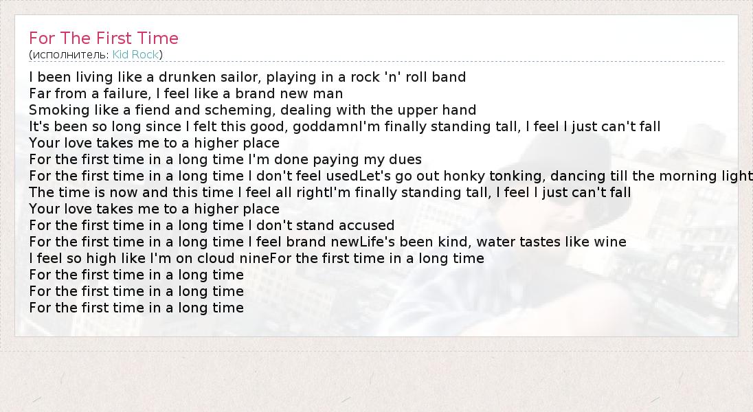 I been living like a drunken sailor, playing in a rock 'n' roll band Far from a failure, I feel like a brand new man Smoking like a fiend and scheming, dealing with the upper hand It's been so long since I felt this good, goddamnI'm finally standing tall, I feel I just can't fall Your love takes me to a higher place For the first time in a long time I'm done paying my dues For the first time in a long time I don't feel usedLet's go out honky tonking, dancing till the morning light The time is now and this time I feel all rightI'm finally standing tall, I feel I just can't fall Your love takes me to a higher place For the first time in a long time I don't stand accused For the first time in a long time I feel brand newLife's been kind, water tastes like wine I feel so high like I'm on cloud nineFor the first time in a long time For the first time in a long time For the first time in a long time For the first time in a long time
